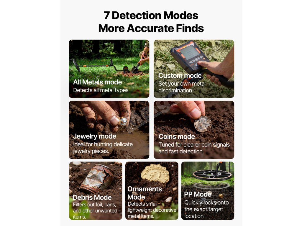 Tento detektor kovov je navrhnutý s cievkou s širokým pokrytím, ktorá skenuje väčšiu plochu za kratší čas, čo vám pomáha rýchlejšie lokalizovať ciele a zvýšiť efektivitu hľadania pokladov.