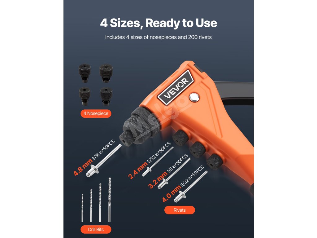Sada nitovača jednoručného, 200 nitov, 4 nástavce, 4 vrtáky, kufrík