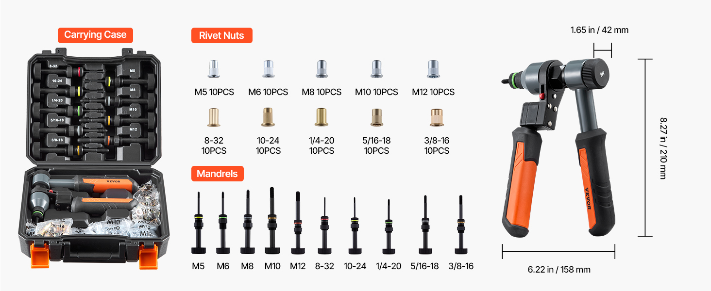 Sada nitovacích matíc 210 mm, 10 nástavcov, 100 ks, m5-m12, 8-32-3/8-16