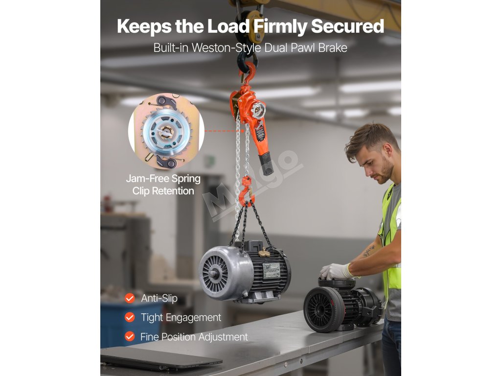 Vybavená vnútornou dvojitou západkovou brzdou v štýle Weston, ktorá rovnomerne rozkladá ťažké zaťaženie. Zabezpečuje bezpečné držanie bremena a zabraňuje náhodným pádom, vďaka čomu sú zdvíhacie operácie bezpečnejšie.