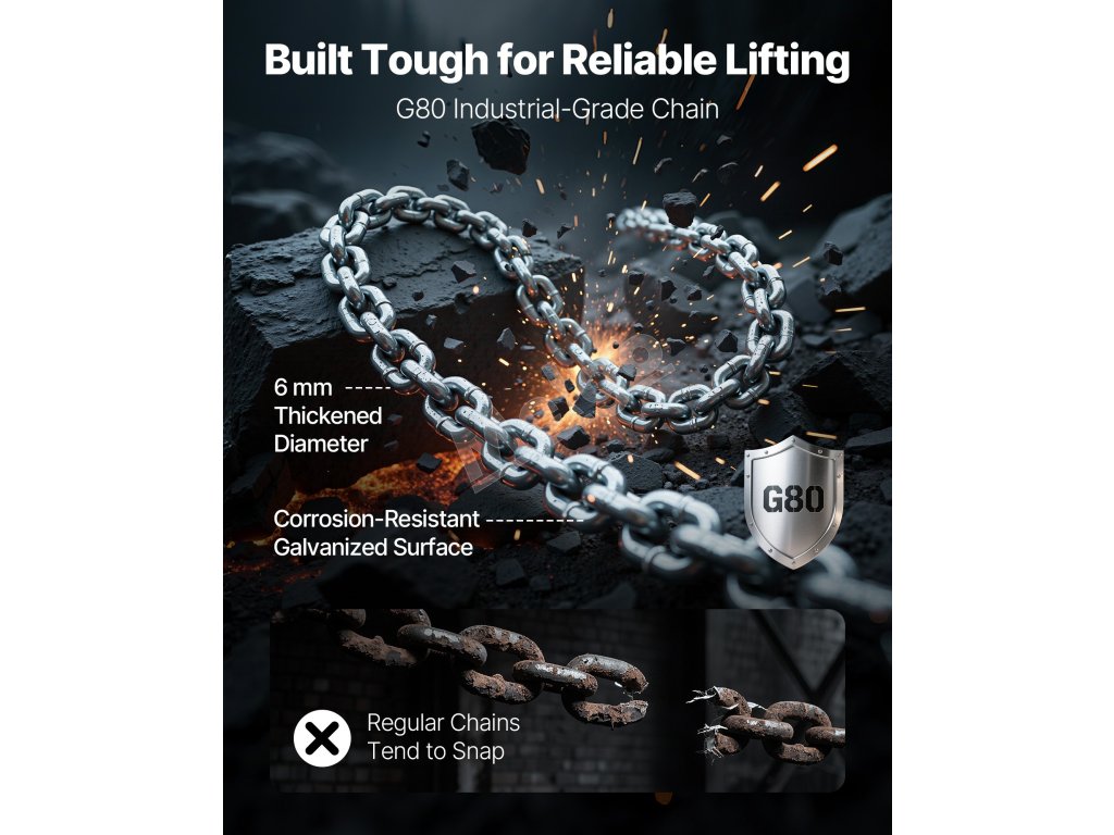 Vyrobené s reťazou G80 priemyselnej triedy, ktorá je skonštruovaná tak, aby odolala veľkým zaťaženiam. Pozinkovaný povrch ponúka odolnosť proti korózii a trvanlivosť, vhodný do rôznych pracovných podmienok.