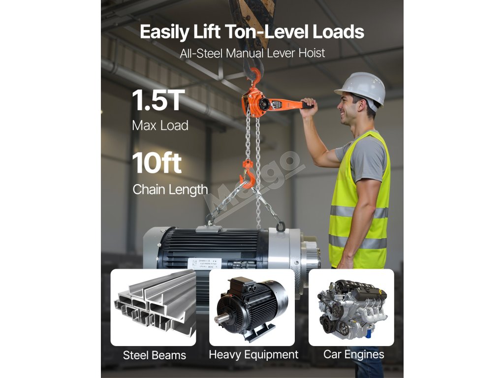 Tento ručný pákový kladkostroj s pozinkovanou reťazou G80 zvládne náročné úlohy, ako je premiestňovanie klád, strojov alebo oceľových nosníkov. Dvojitá západková brzda v štýle Weston a vedená drážka na reťaz zabezpečujú hladkú a bezpečnú prevádzku.