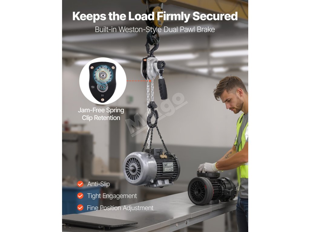 Vybavená vnútornou dvojitou západkovou brzdou v štýle Weston, ktorá rovnomerne rozkladá ťažké zaťaženie. Zabezpečuje bezpečné držanie bremena a zabraňuje náhodným pádom, vďaka čomu sú zdvíhacie operácie bezpečnejšie.