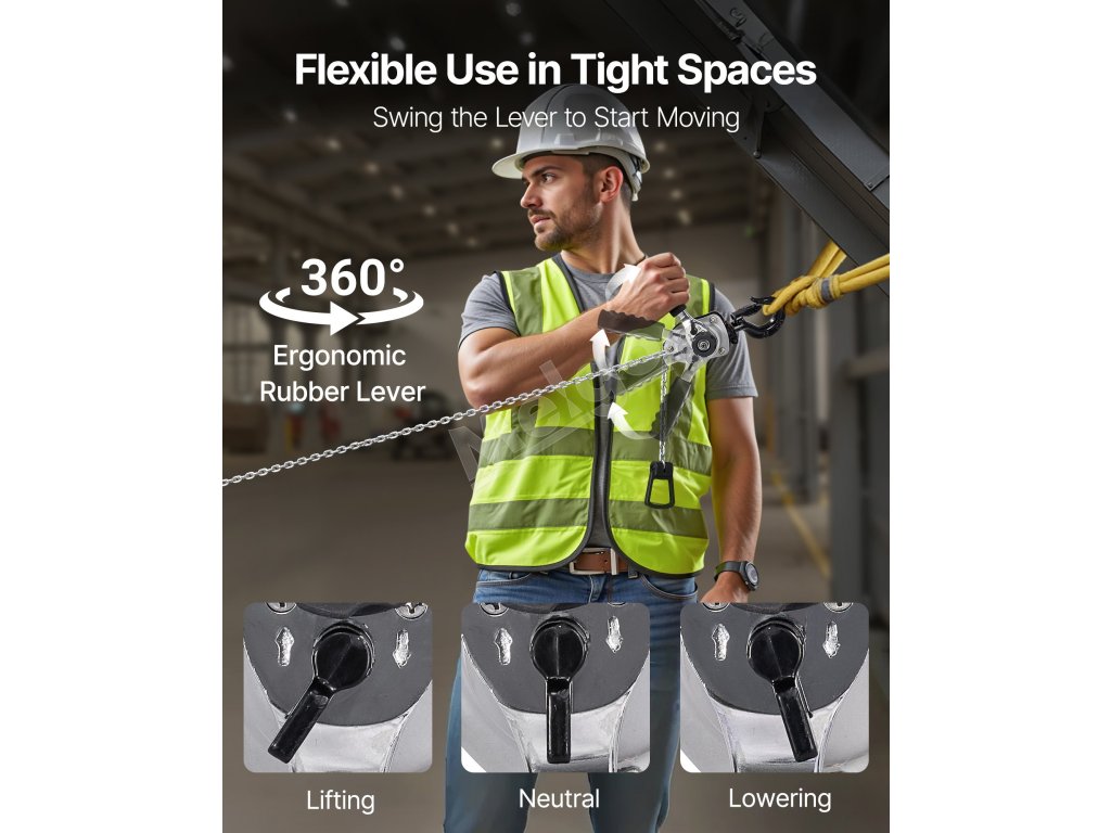 Tento ručný pákový kladkostroj s pozinkovanou reťazou G80 zvládne náročné úlohy, ako je premiestňovanie klád, strojov alebo oceľových nosníkov. Dvojitá západková brzda v štýle Weston a vedená drážka na reťaz zabezpečujú hladkú a bezpečnú prevádzku.