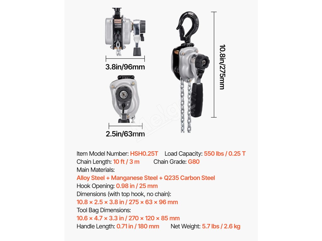 Ručný páčkový reťazový kladkostroj 1/4t 250kg 3m g80, 360° otočné háky