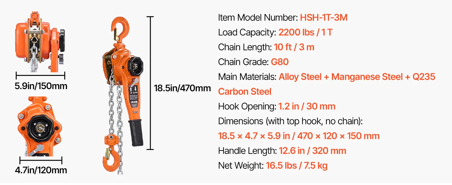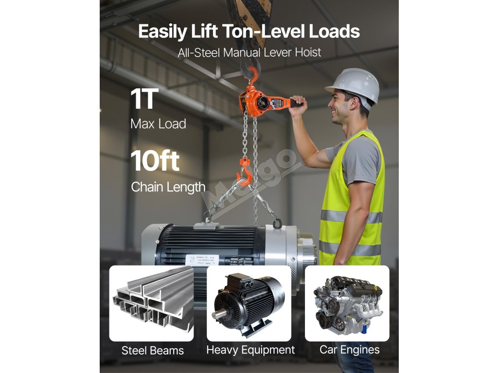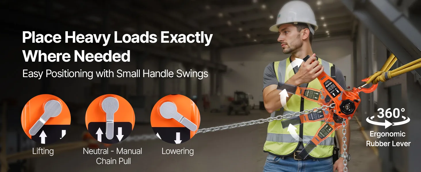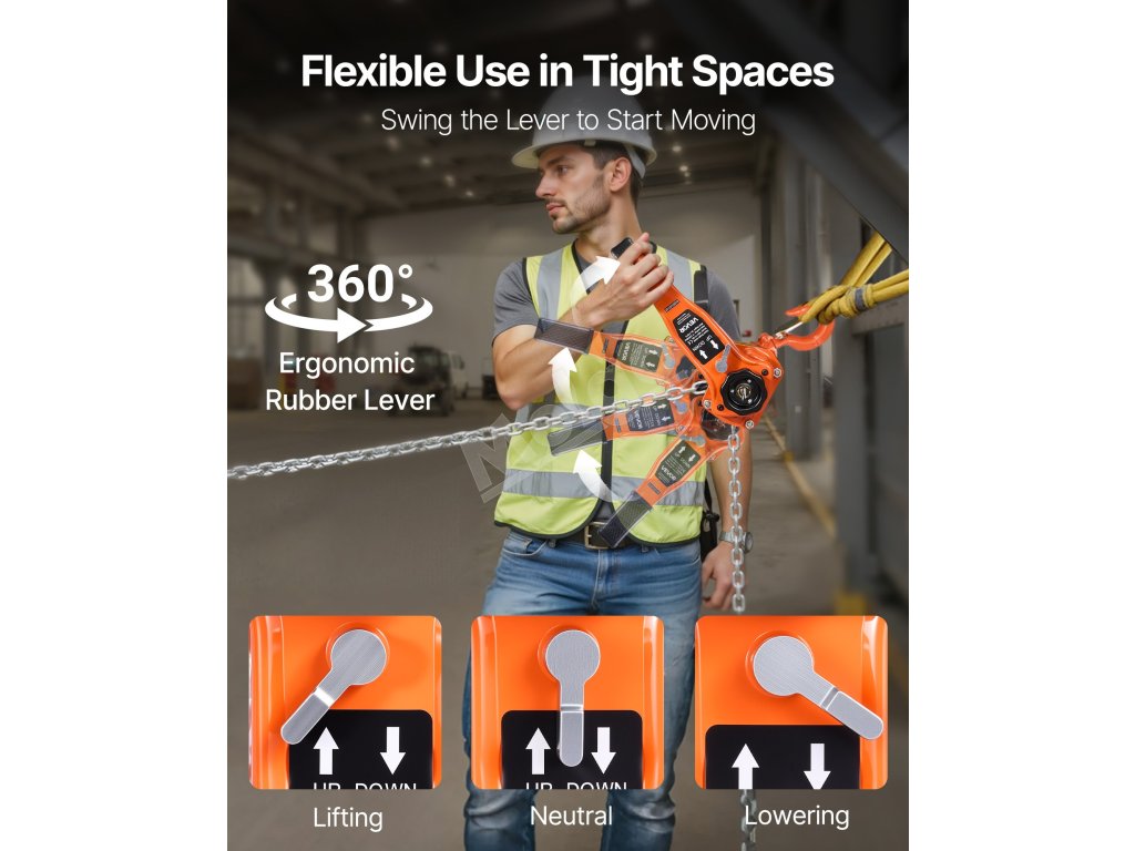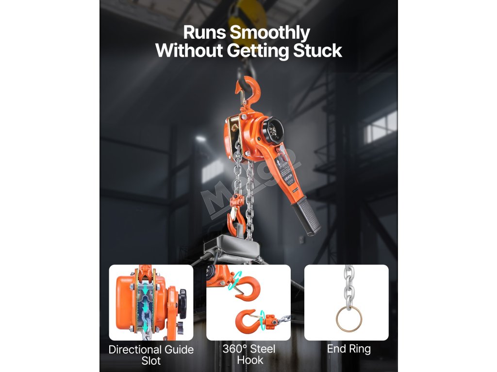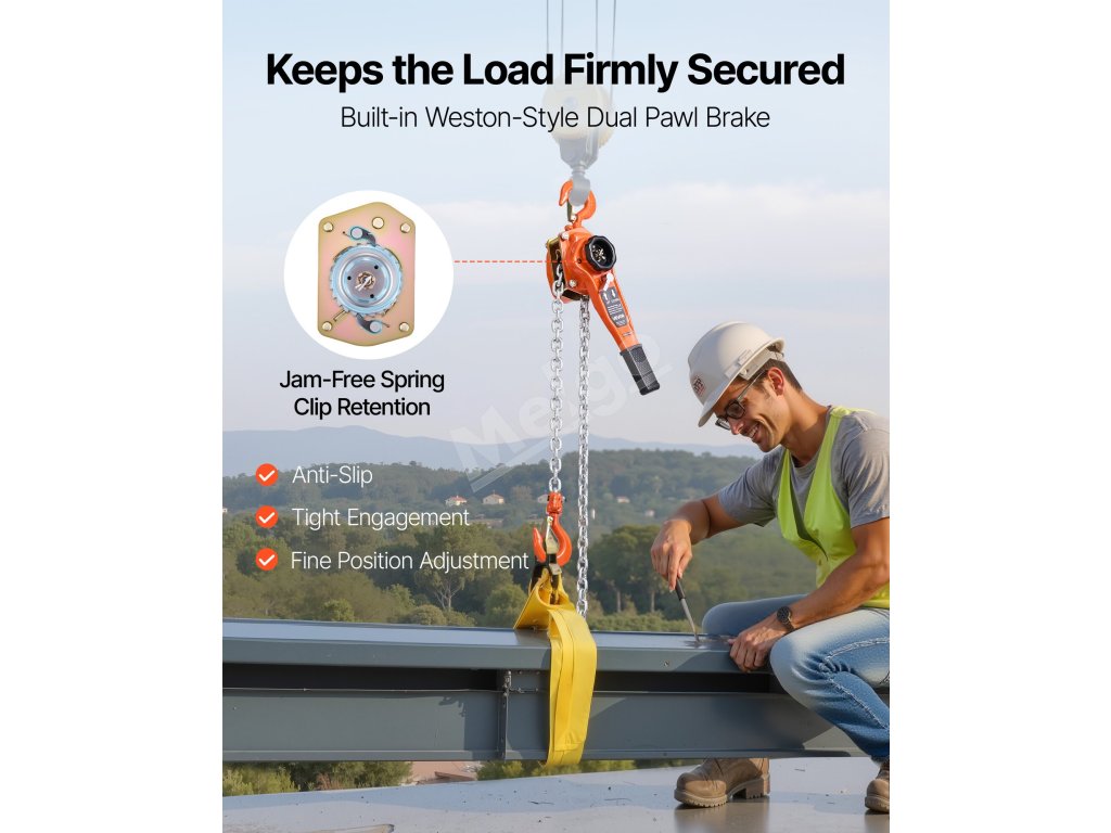 Tento ručný pákový kladkostroj s pozinkovanou reťazou G80 zvládne náročné úlohy, ako je premiestňovanie klád, strojov alebo oceľových nosníkov. Dvojitá západková brzda v štýle Weston a vedená drážka na reťaz zabezpečujú hladkú a bezpečnú prevádzku.