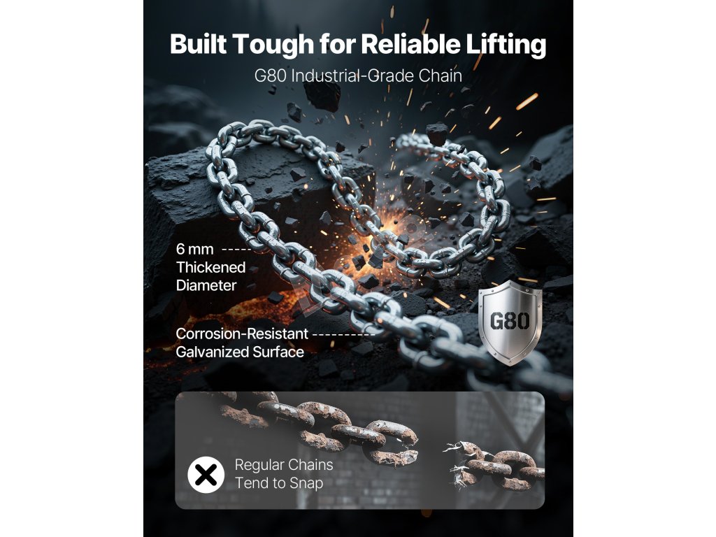 Vyrobené s reťazou G80 priemyselnej triedy, ktorá je skonštruovaná tak, aby odolala veľkým zaťaženiam. Pozinkovaný povrch ponúka odolnosť proti korózii a trvanlivosť, vhodný do rôznych pracovných podmienok.