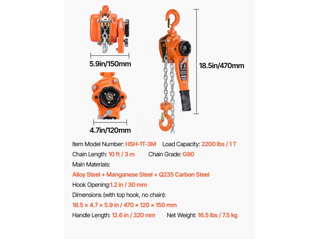 Manuálny reťazový kladkostroj 1t 1000kg 3m g80 reťaz 360° háky