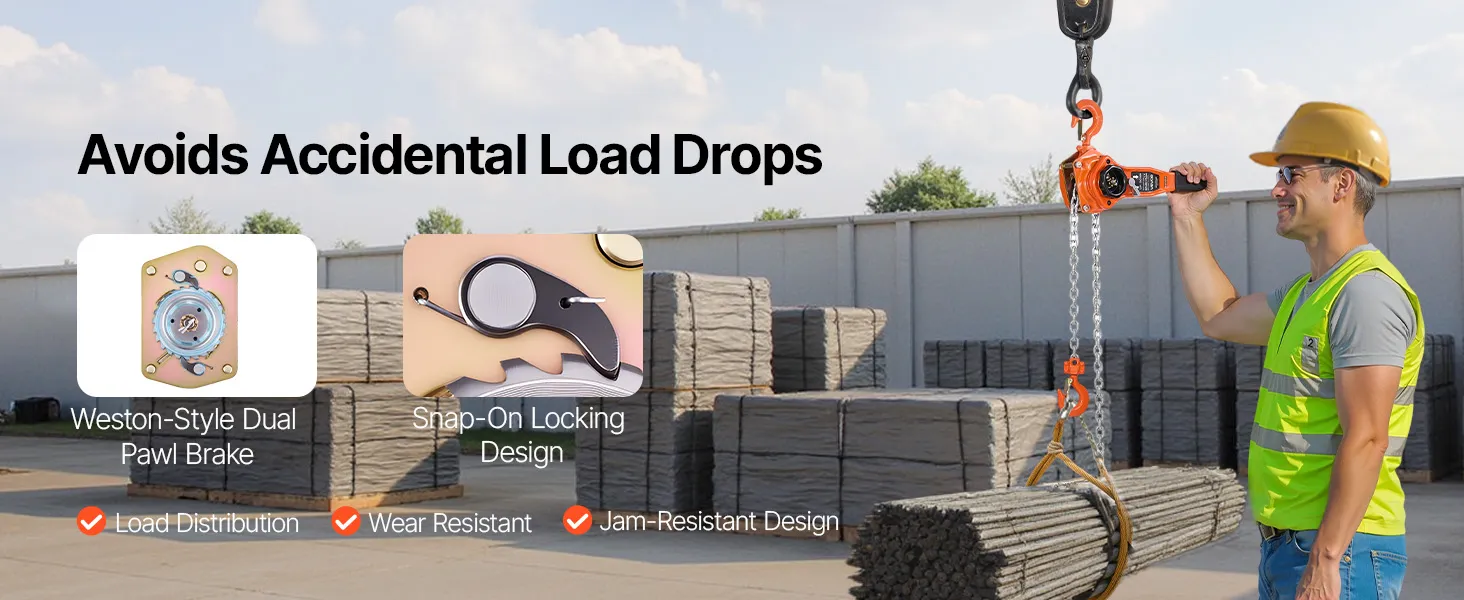 Vybavená vnútornou dvojitou západkovou brzdou v štýle Weston, ktorá rovnomerne rozkladá ťažké zaťaženie. Zabezpečuje bezpečné držanie bremena a zabraňuje náhodným pádom, vďaka čomu sú zdvíhacie operácie bezpečnejšie.
