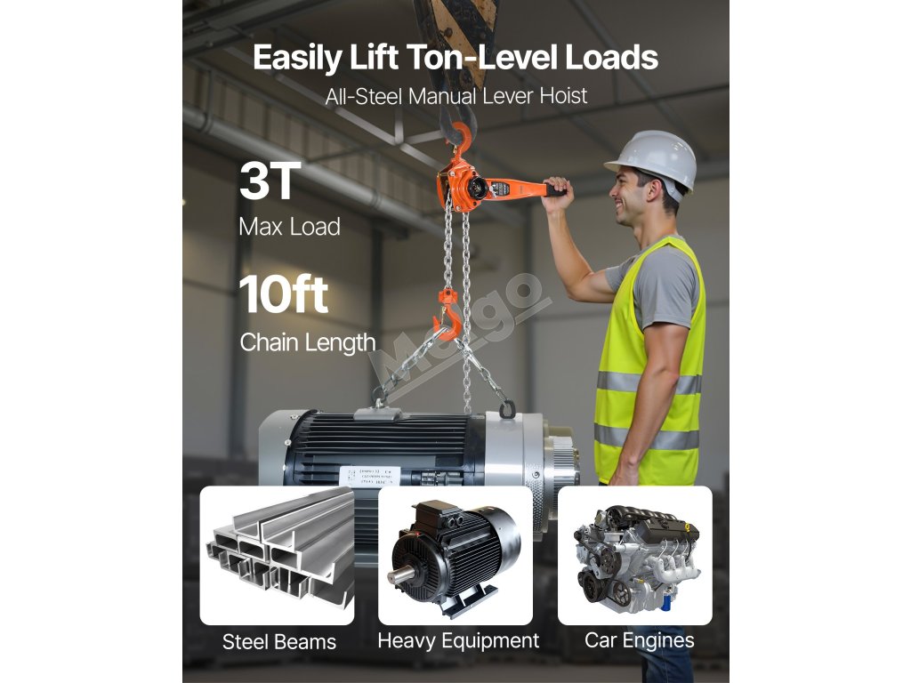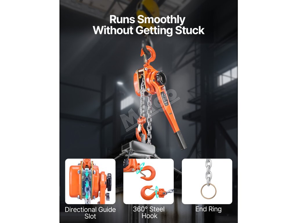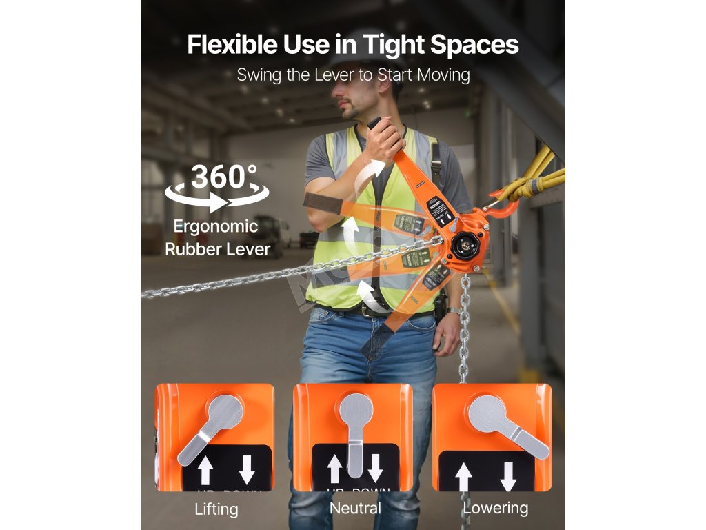 Tento ručný pákový kladkostroj s pozinkovanou reťazou G80 zvládne náročné úlohy, ako je premiestňovanie klád, strojov alebo oceľových nosníkov. Dvojitá západková brzda v štýle Weston a vedená drážka na reťaz zabezpečujú hladkú a bezpečnú prevádzku.