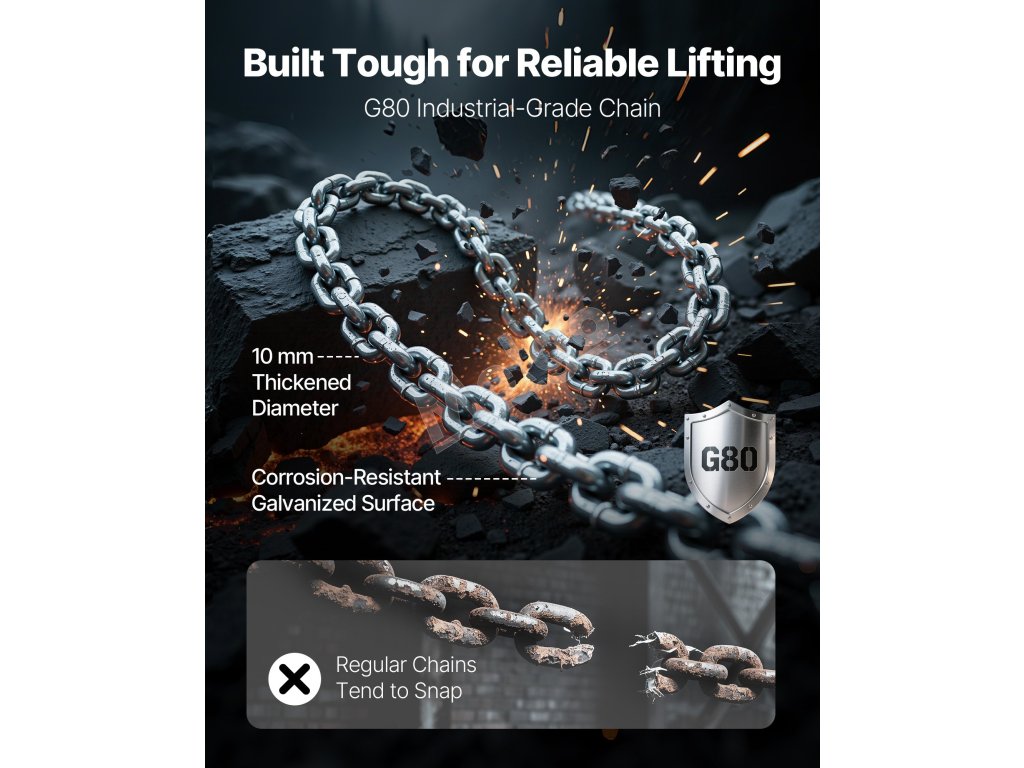 Vyrobené s reťazou G80 priemyselnej triedy, ktorá je skonštruovaná tak, aby odolala veľkým zaťaženiam. Pozinkovaný povrch ponúka odolnosť proti korózii a trvanlivosť, vhodný do rôznych pracovných podmienok.