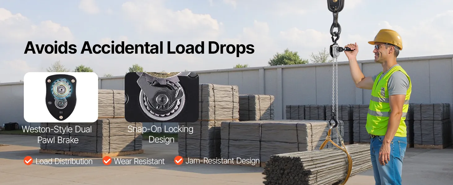 Vybavená vnútornou dvojitou západkovou brzdou v štýle Weston, ktorá rovnomerne rozkladá ťažké zaťaženie. Zabezpečuje bezpečné držanie bremena a zabraňuje náhodným pádom, vďaka čomu sú zdvíhacie operácie bezpečnejšie.
