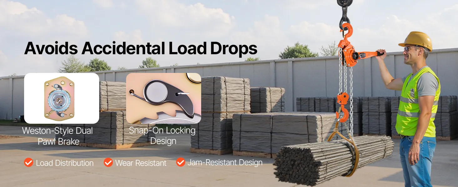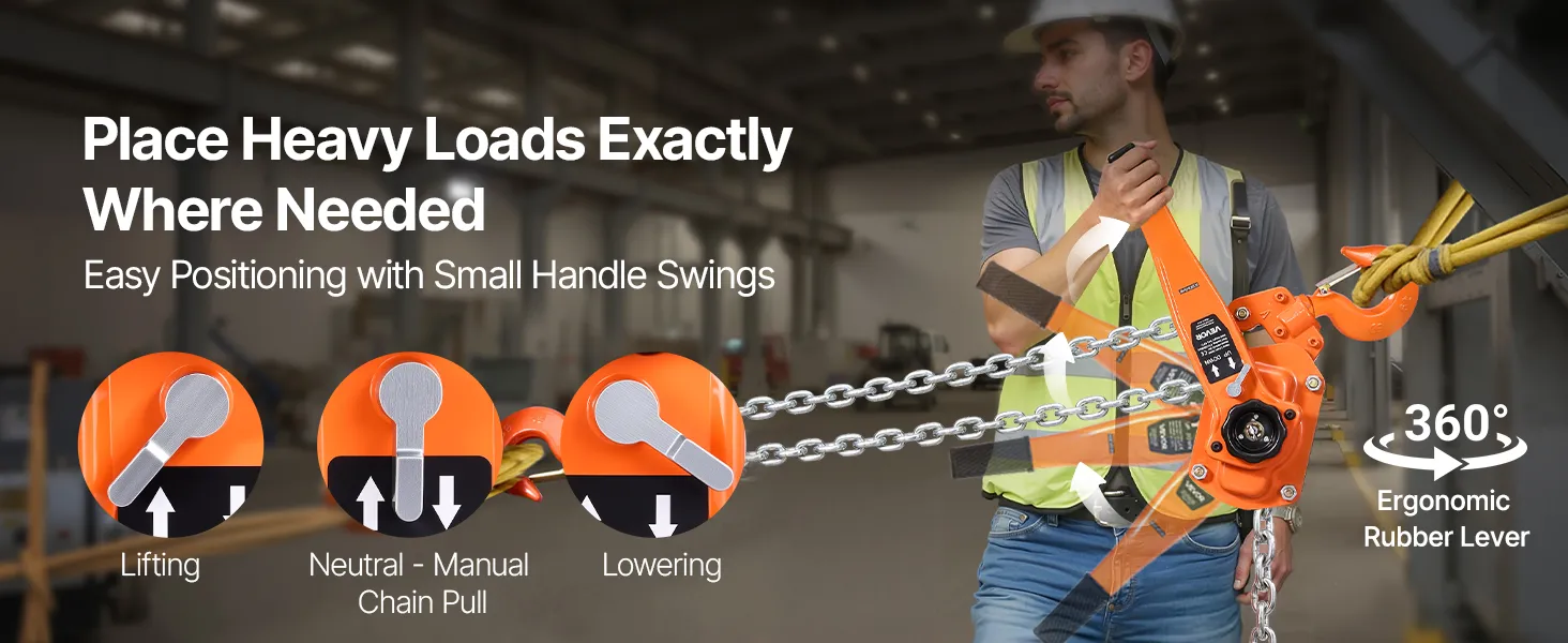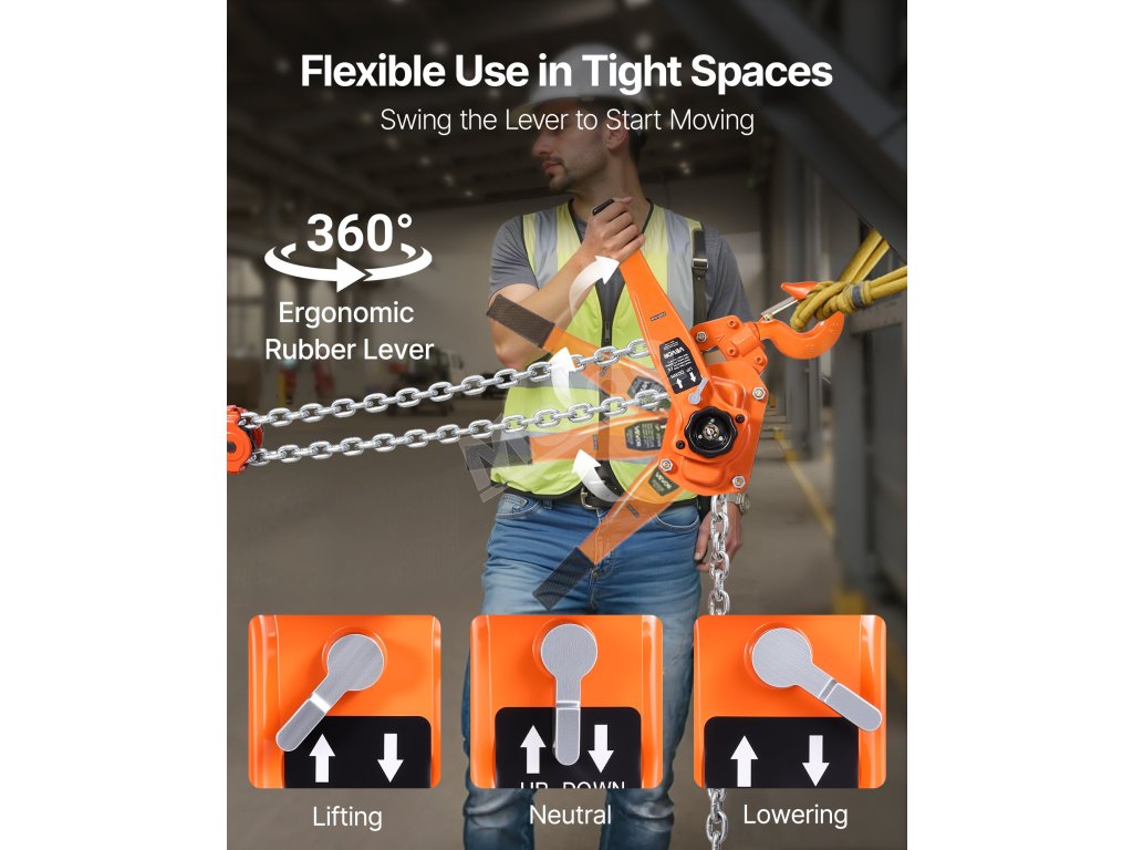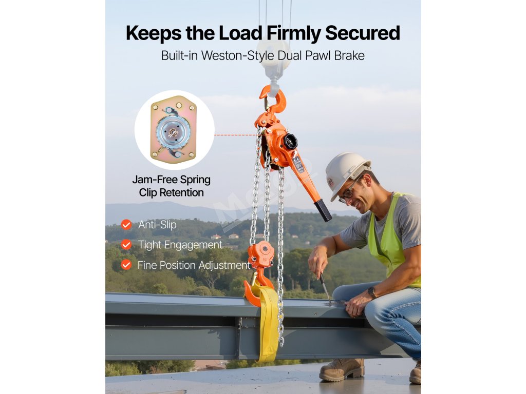 Tento ručný pákový kladkostroj s pozinkovanou reťazou G80 zvládne náročné úlohy, ako je premiestňovanie klád, strojov alebo oceľových nosníkov. Dvojitá západková brzda v štýle Weston a vedená drážka na reťaz zabezpečujú hladkú a bezpečnú prevádzku.