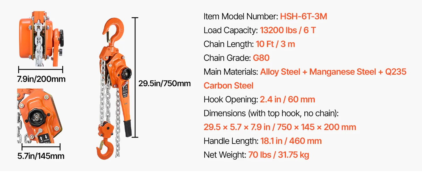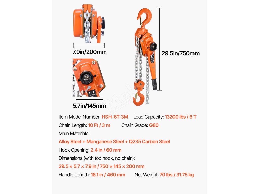 Ručná reťazová kladka 6T 6000KG, zdvih 3M, G80 reťaz, otočné háky