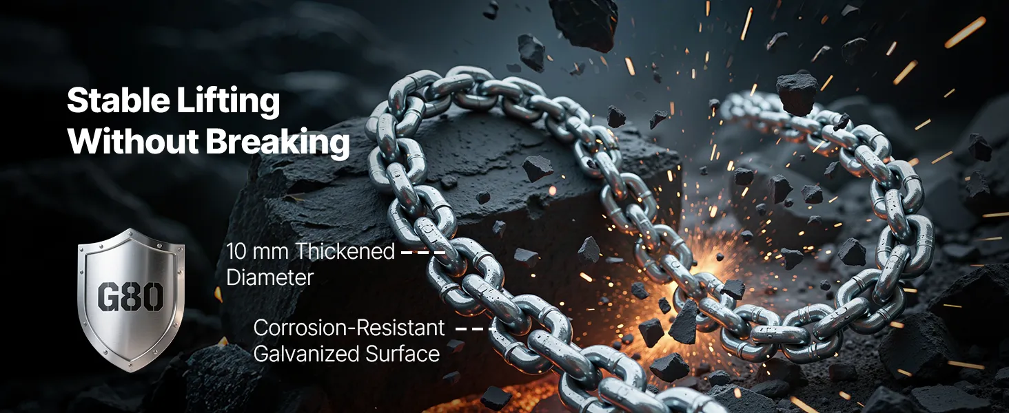 Vyrobené s reťazou G80 priemyselnej triedy, ktorá je skonštruovaná tak, aby odolala veľkým zaťaženiam. Pozinkovaný povrch ponúka odolnosť proti korózii a trvanlivosť, vhodný do rôznych pracovných podmienok.