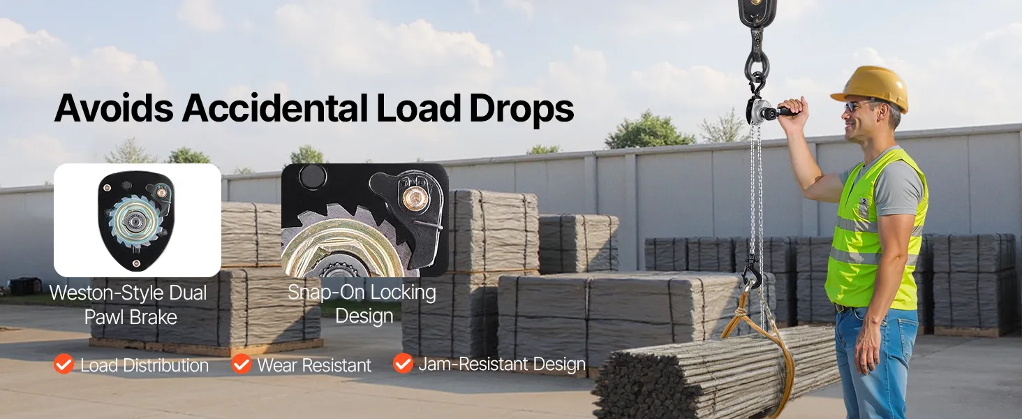Vybavená vnútornou dvojitou západkovou brzdou v štýle Weston, ktorá rovnomerne rozkladá ťažké zaťaženie. Zabezpečuje bezpečné držanie bremena a zabraňuje náhodným pádom, vďaka čomu sú zdvíhacie operácie bezpečnejšie.