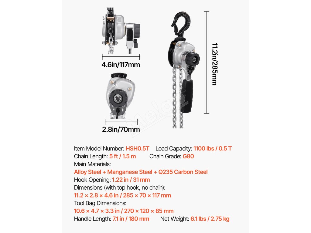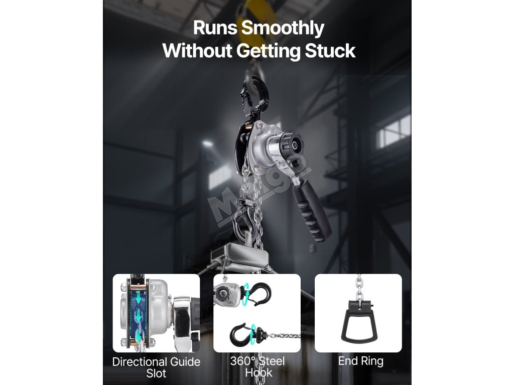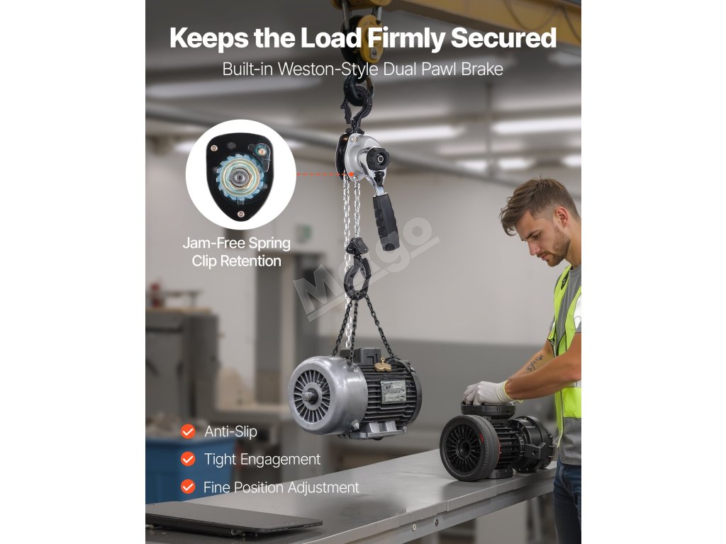 Tento ručný pákový kladkostroj s pozinkovanou reťazou G80 zvládne náročné úlohy, ako je premiestňovanie klád, strojov alebo oceľových nosníkov. Dvojitá západková brzda v štýle Weston a vedená drážka na reťaz zabezpečujú hladkú a bezpečnú prevádzku.