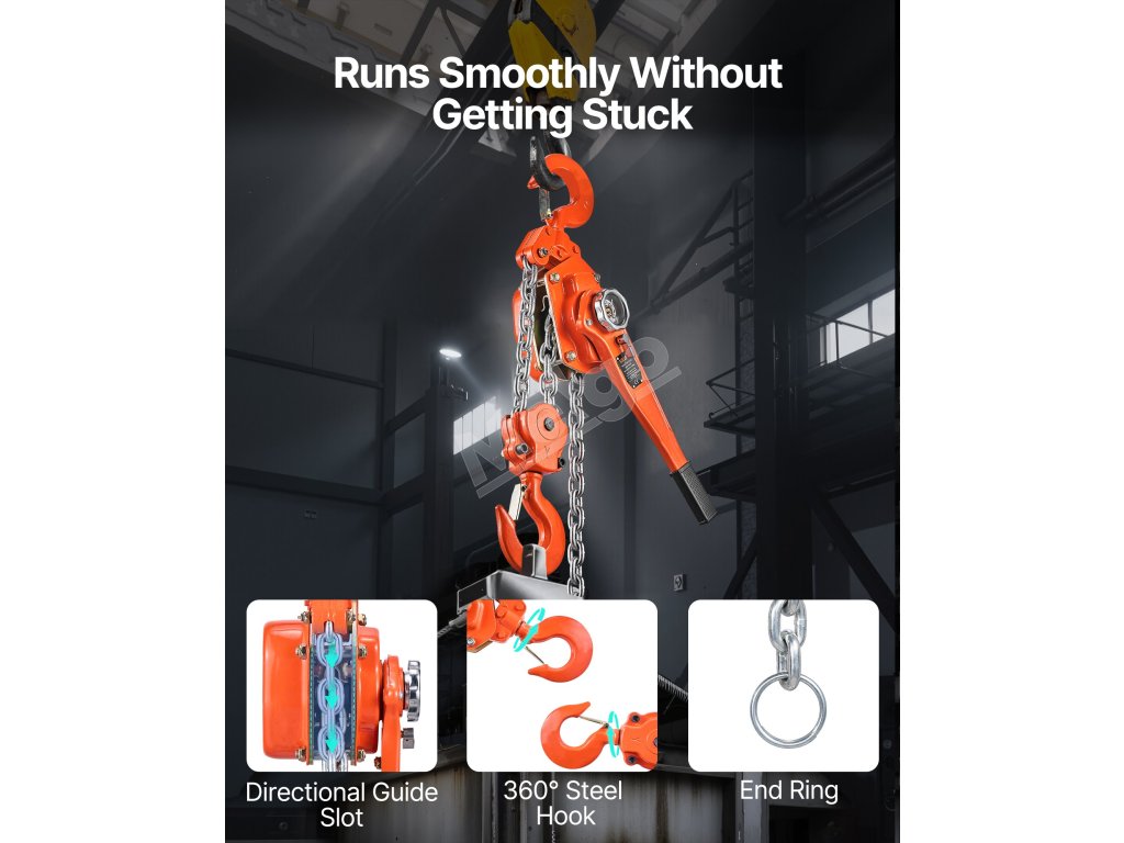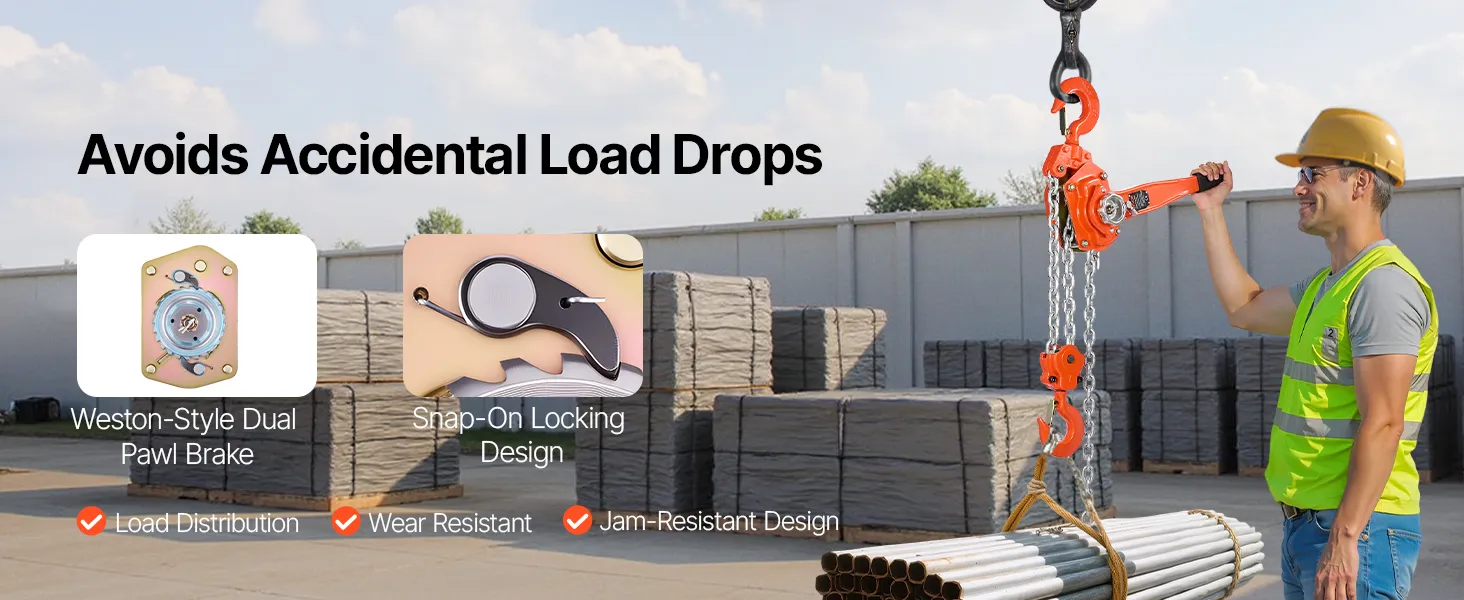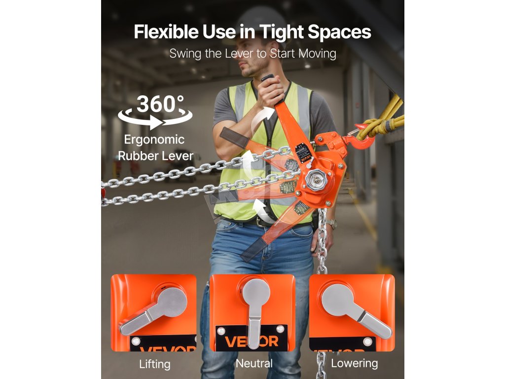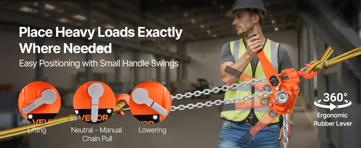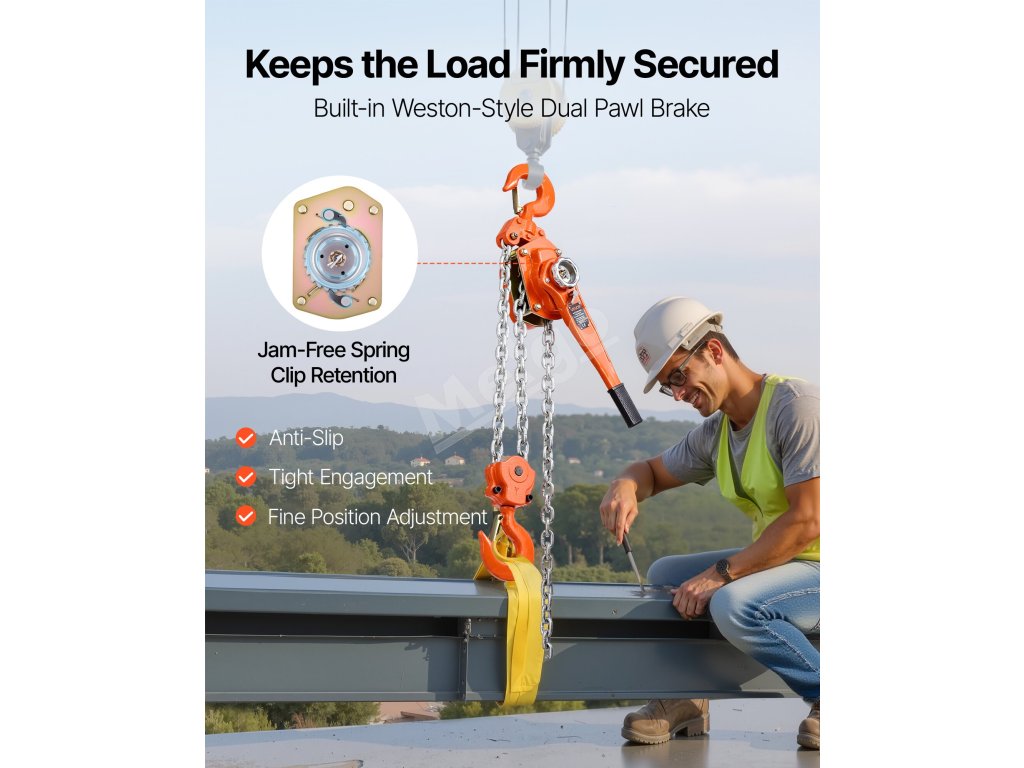 Tento ručný pákový kladkostroj s pozinkovanou reťazou G80 zvládne náročné úlohy, ako je premiestňovanie klád, strojov alebo oceľových nosníkov. Dvojitá západková brzda v štýle Weston a vedená drážka na reťaz zabezpečujú hladkú a bezpečnú prevádzku.