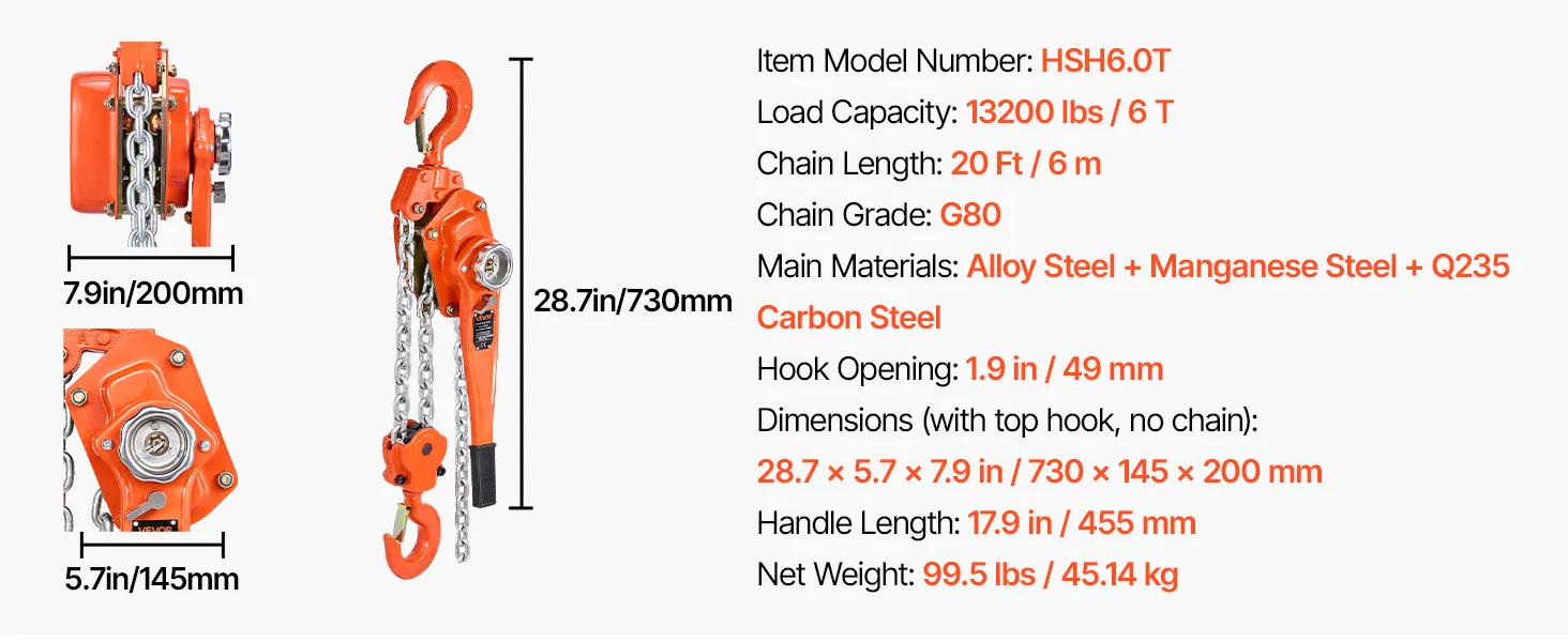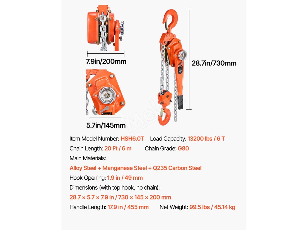 Ručný reťazový kladkostroj 6 t, zdvih 6 m, reťaz G80, 360° háky