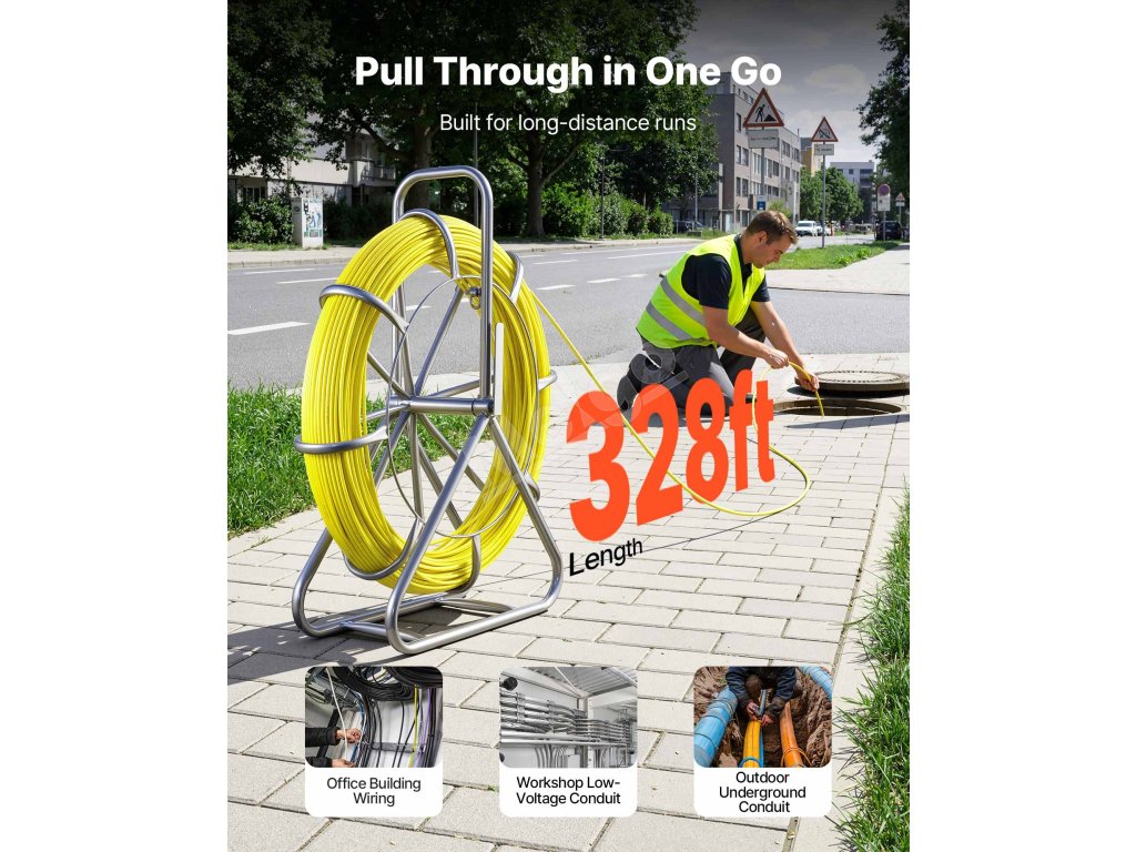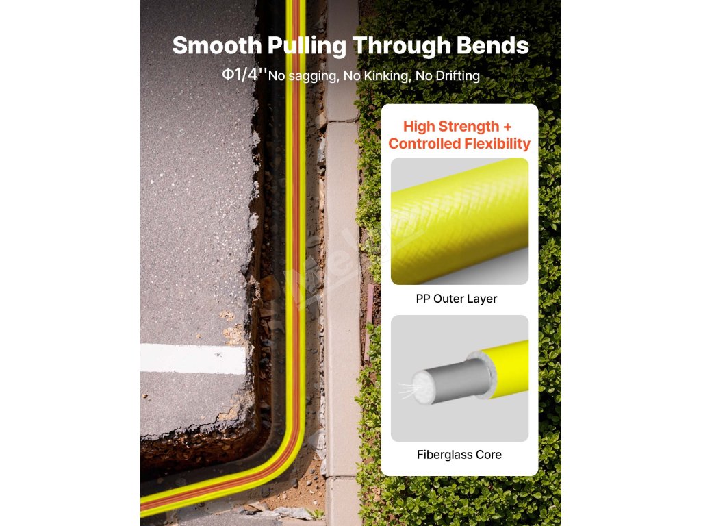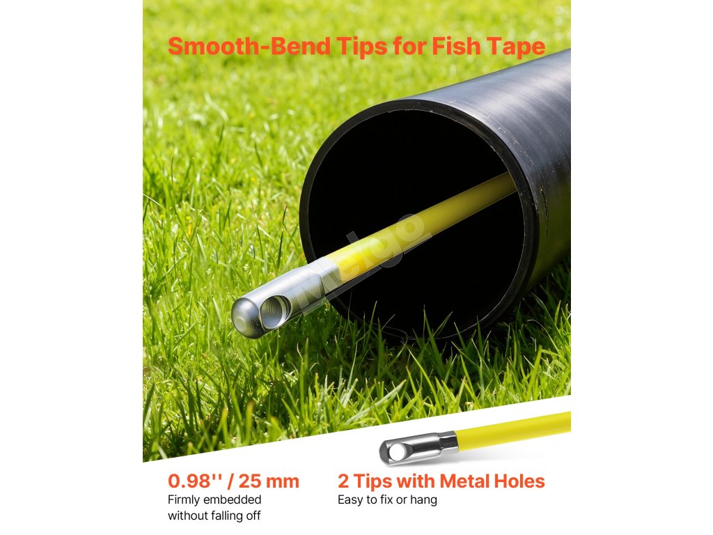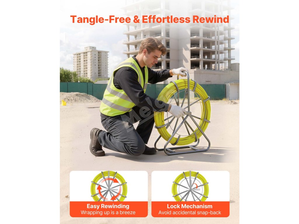 Táto rybárska páska je určená na dlhé vzdialenosti a zložité zapojenie, je nevodivá a odolná proti korózii. Uzamykací mechanizmus zabezpečuje navíjanie bez zamotania, zatiaľ čo dve vymeniteľné kovové ťahacie hlavy ľahko kĺžu cez potrubia. Jasné označenia každé 2 stopy vám pomáhajú ľahko kontrolovať dĺžku kábla.