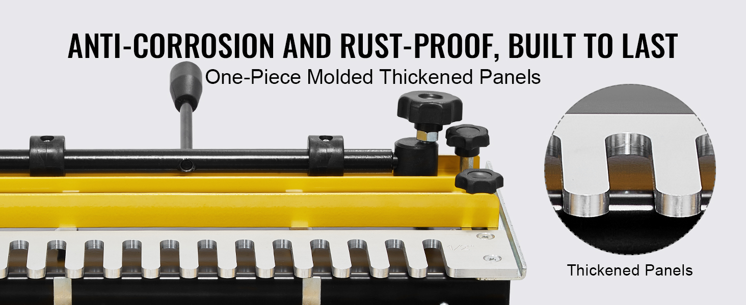 Naša šablóna na čapové spoje je vyrobená z jedného kusu zosilnenej hliníkovej zliatiny a je opatrená povrchovou úpravou, ktorá poskytuje vynikajúcu odolnosť proti korózii a hrdzi. To zaručuje odolnosť a dlhú životnosť, zatiaľ čo vysoká presnosť zabezpečuje vynikajúce uchytenie so všetkým príslušenstvom.