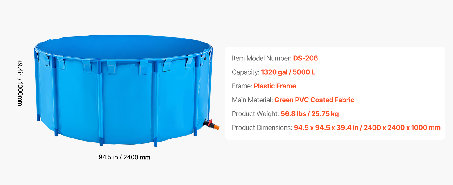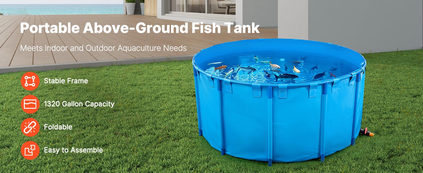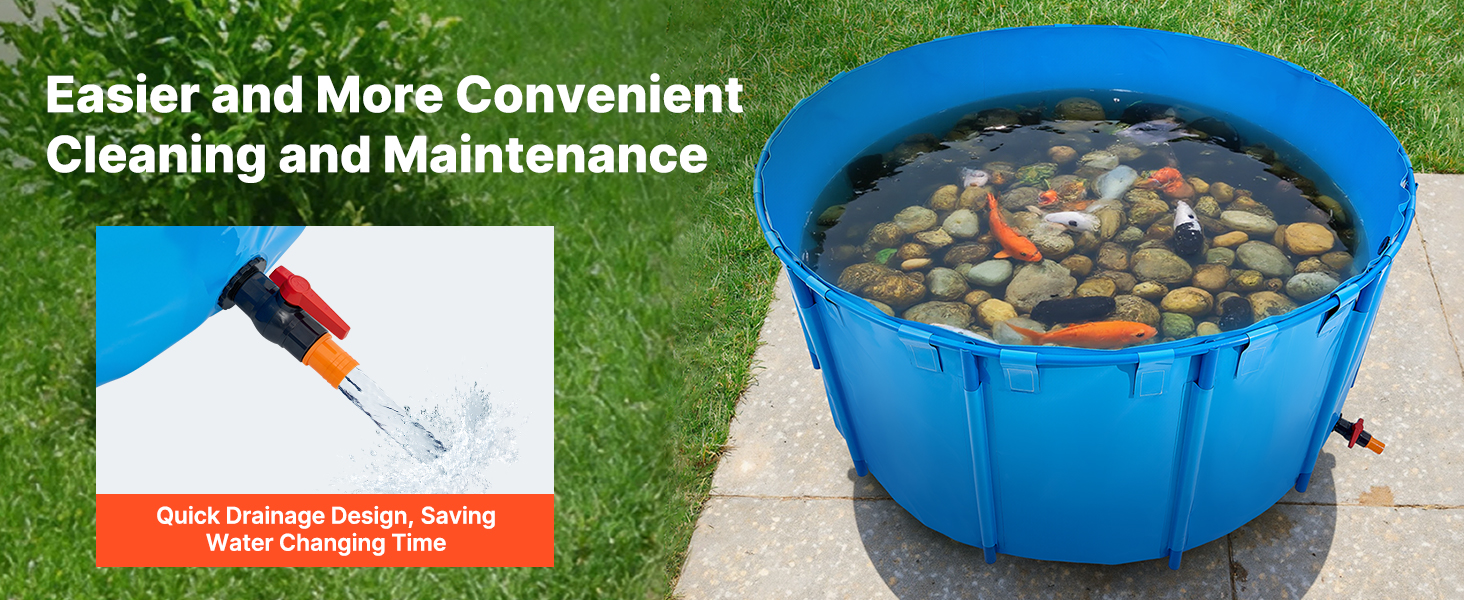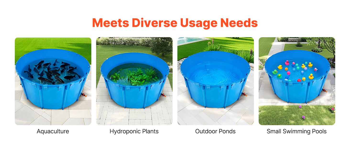 Tento rybník, vyrobený zo zahusteného PVC materiálu, je odolný proti opotrebeniu a má neprepustné švy. Odolné PVC rúrky zaručujú dlhodobé používanie. Jeho kapacita 1320 galónov poskytuje dostatok priestoru pre vodné živočíchy, ako sú koi, zlaté rybky, krevety a kraby, a je ideálny pre použitie v interiéri aj exteriéri.