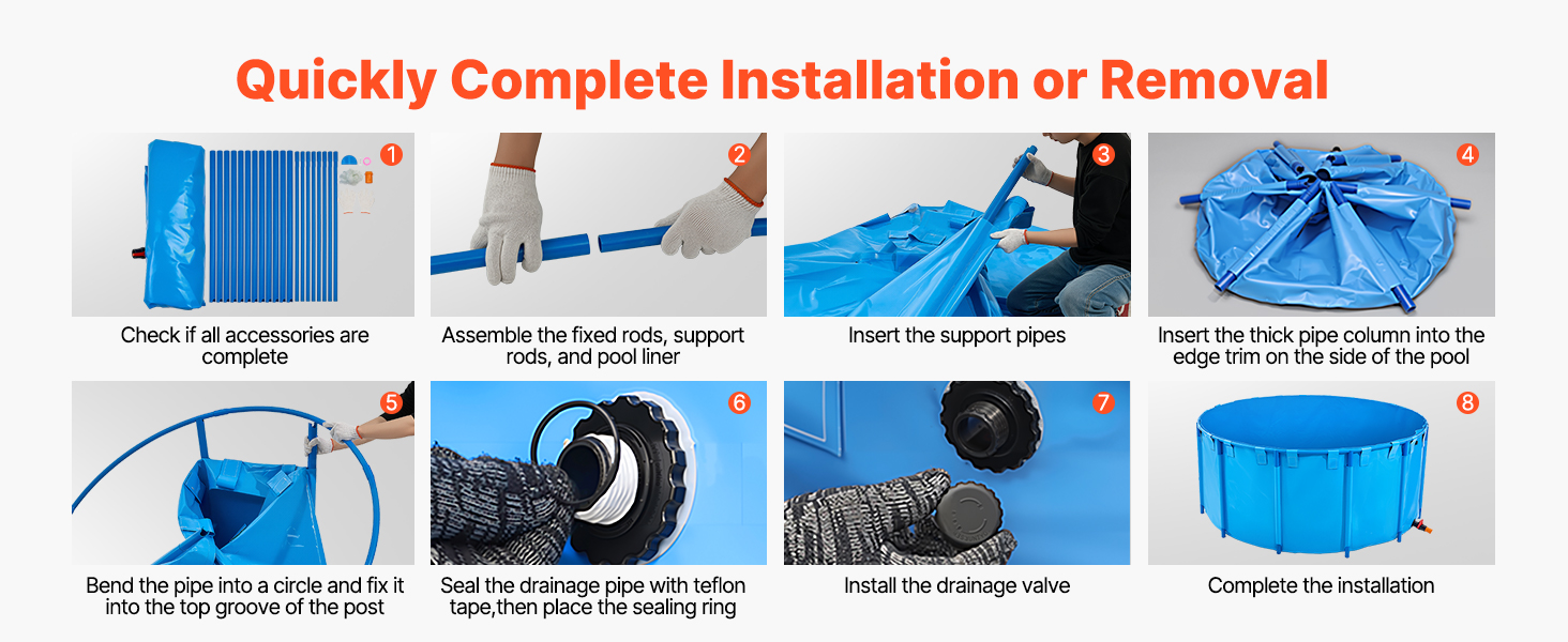 Naše nadzemné rybníky nevyžadujú žiadne ďalšie nástroje na rýchlu inštaláciu alebo demontáž. Celý proces je jednoduchý, efektívny a časovo nenáročný, čo ho robí veľmi pohodlným na používanie.