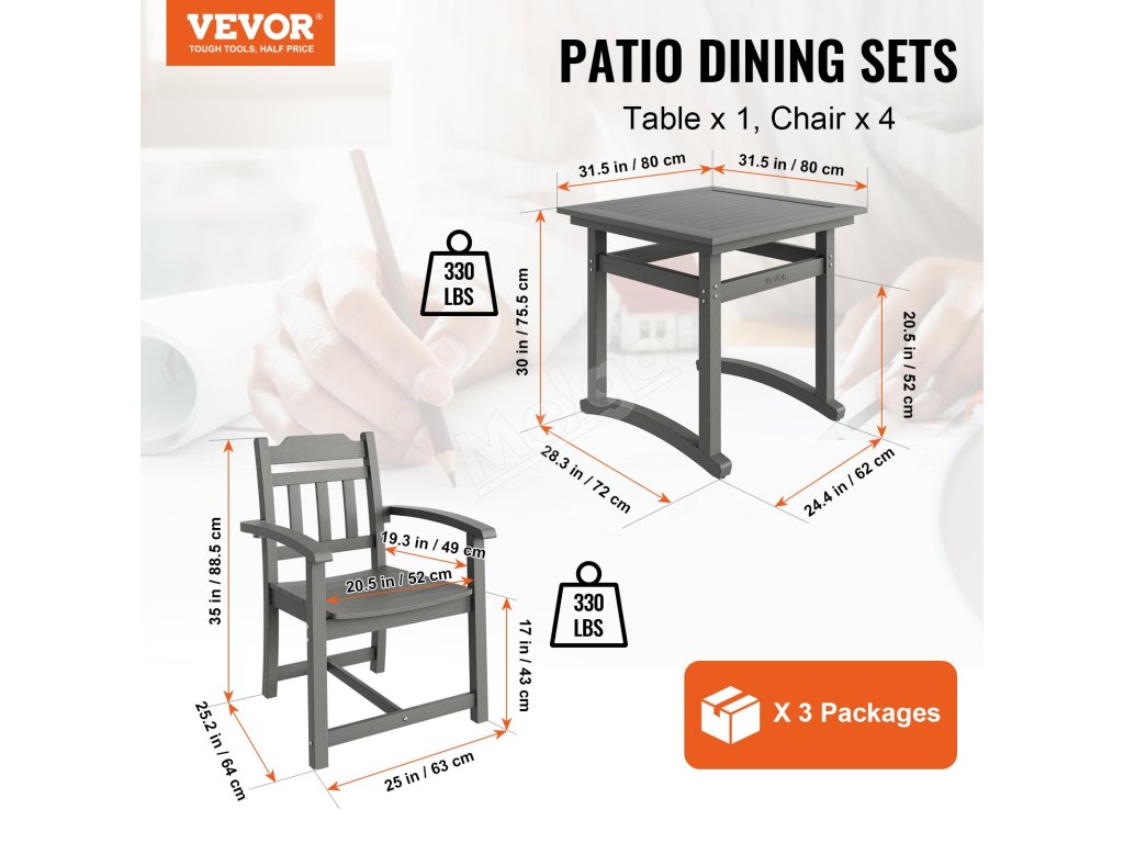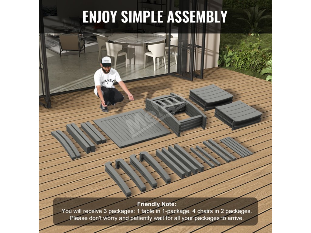 Súprava sa dodáva v 3 baleniach (1 stôl v 1 balení, 4 stoličky v 2 baleniach) na jednoduchú a pohodlnú montáž.