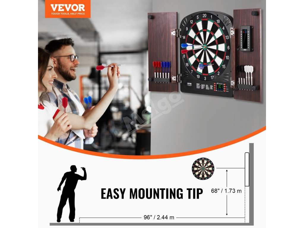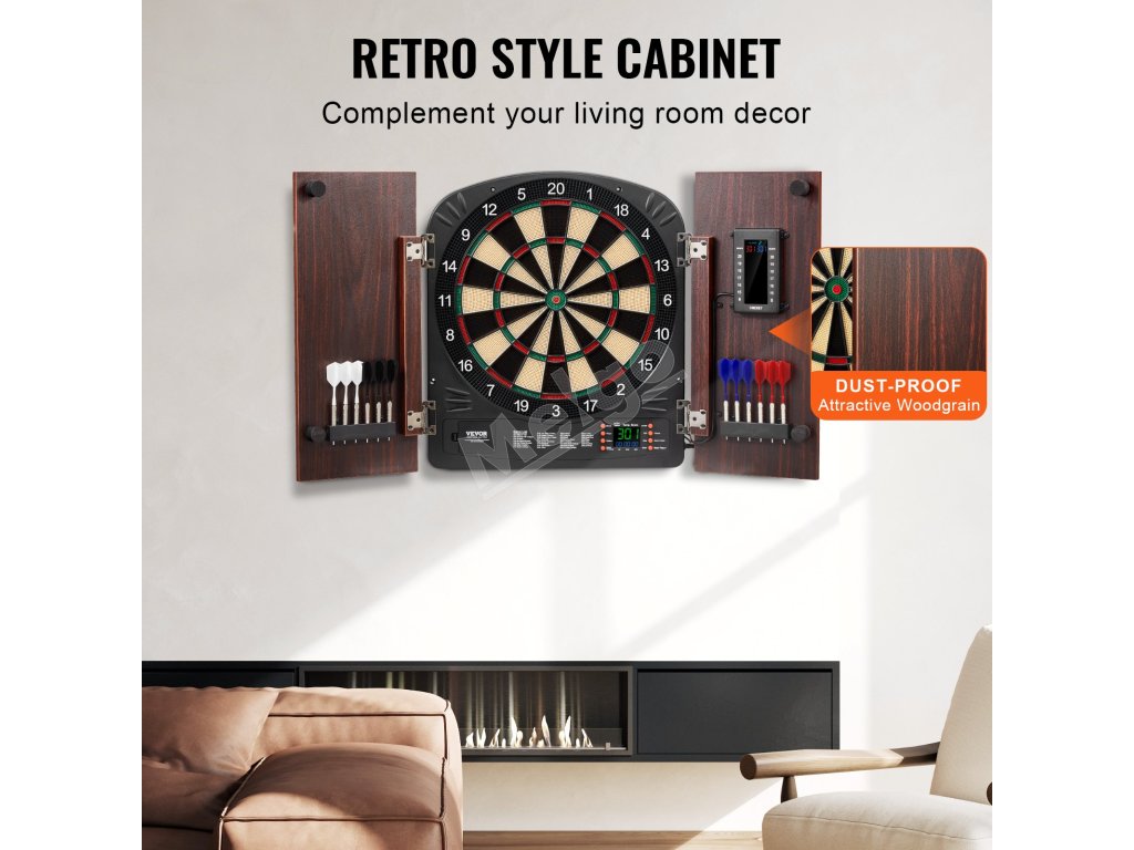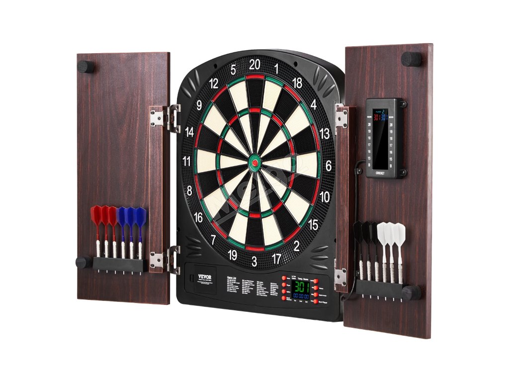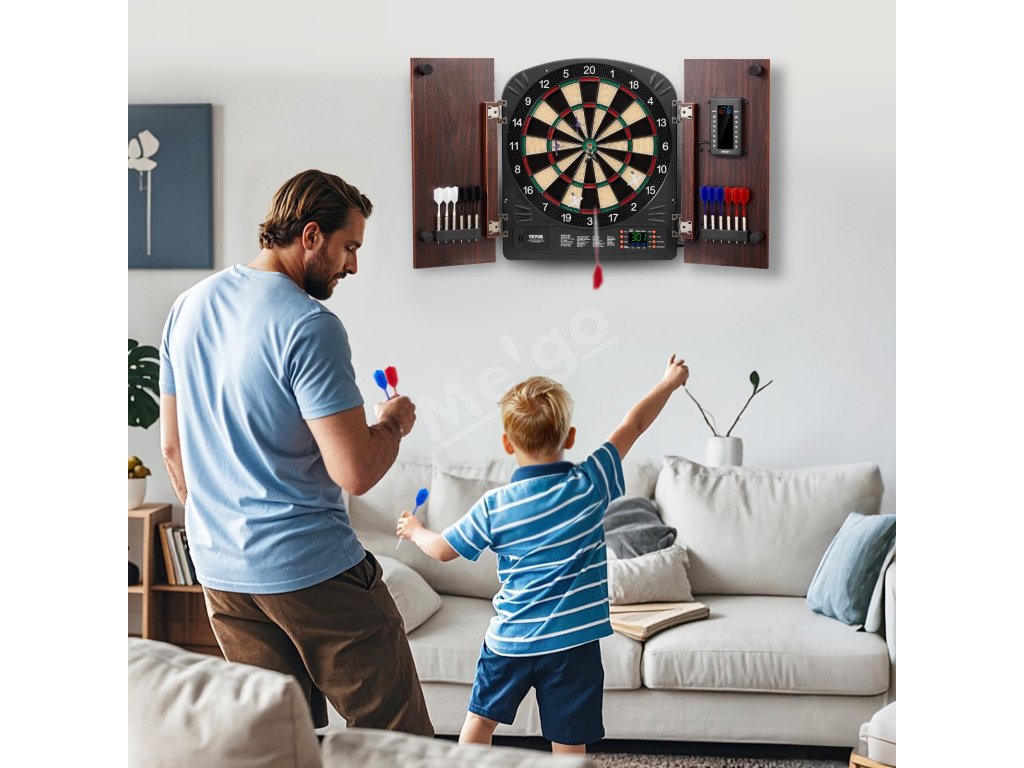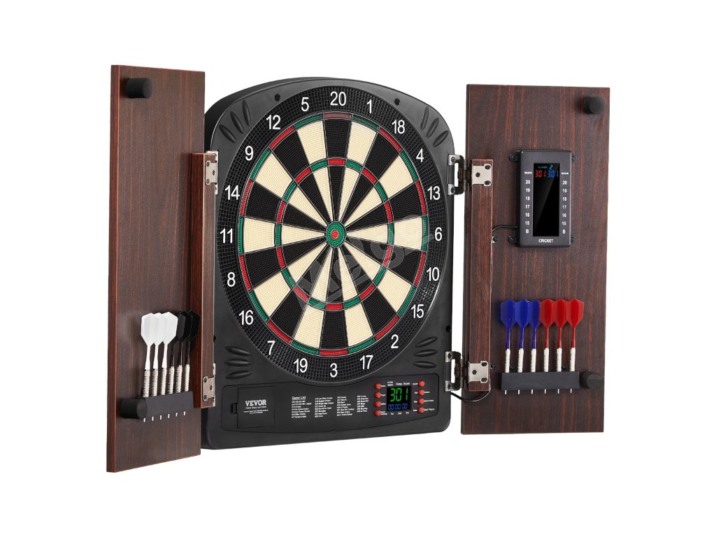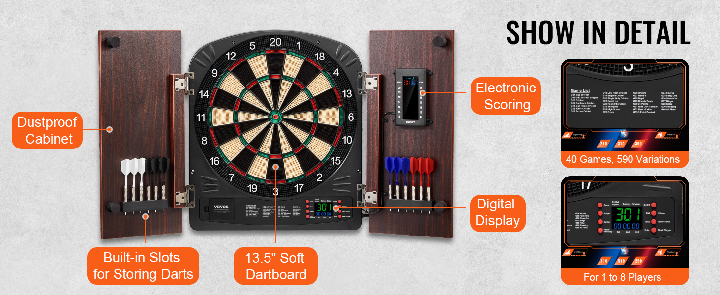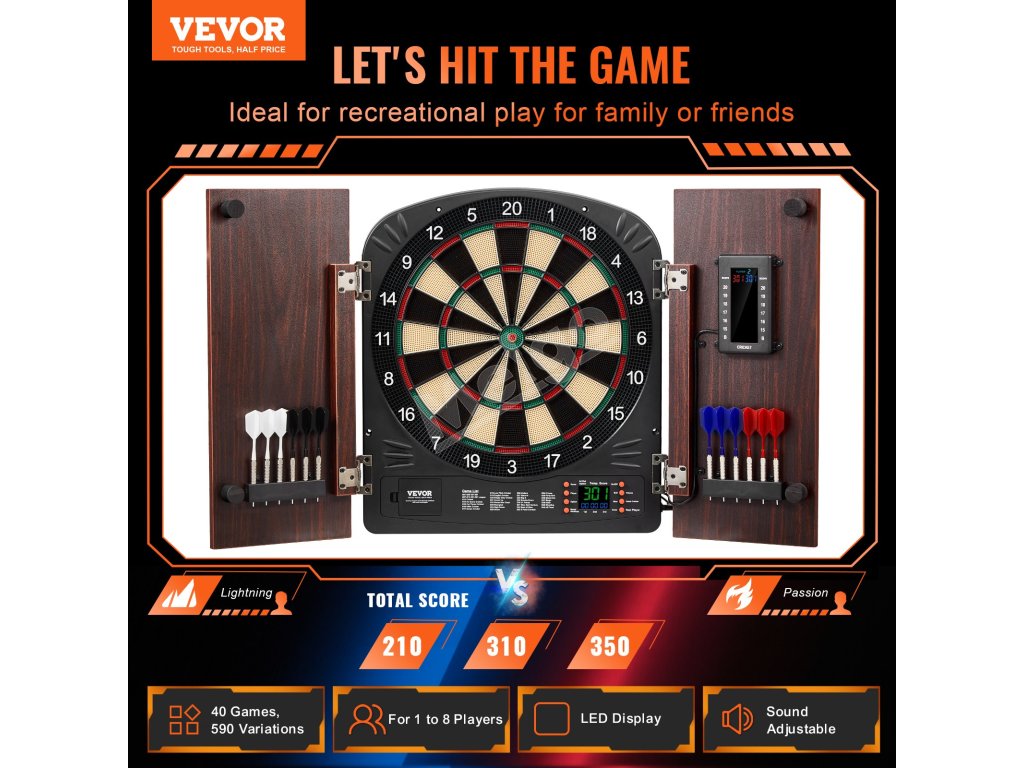 Táto súprava šípok a skrinky obsahuje 40 rôznych hier s 590 variantmi, ktoré sú vhodné pre 1 až 8 hráčov. Displej LED a nastaviteľné nastavenia zvuku zlepšujú hranie.