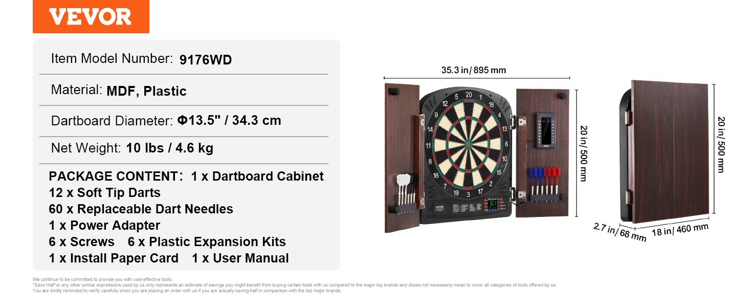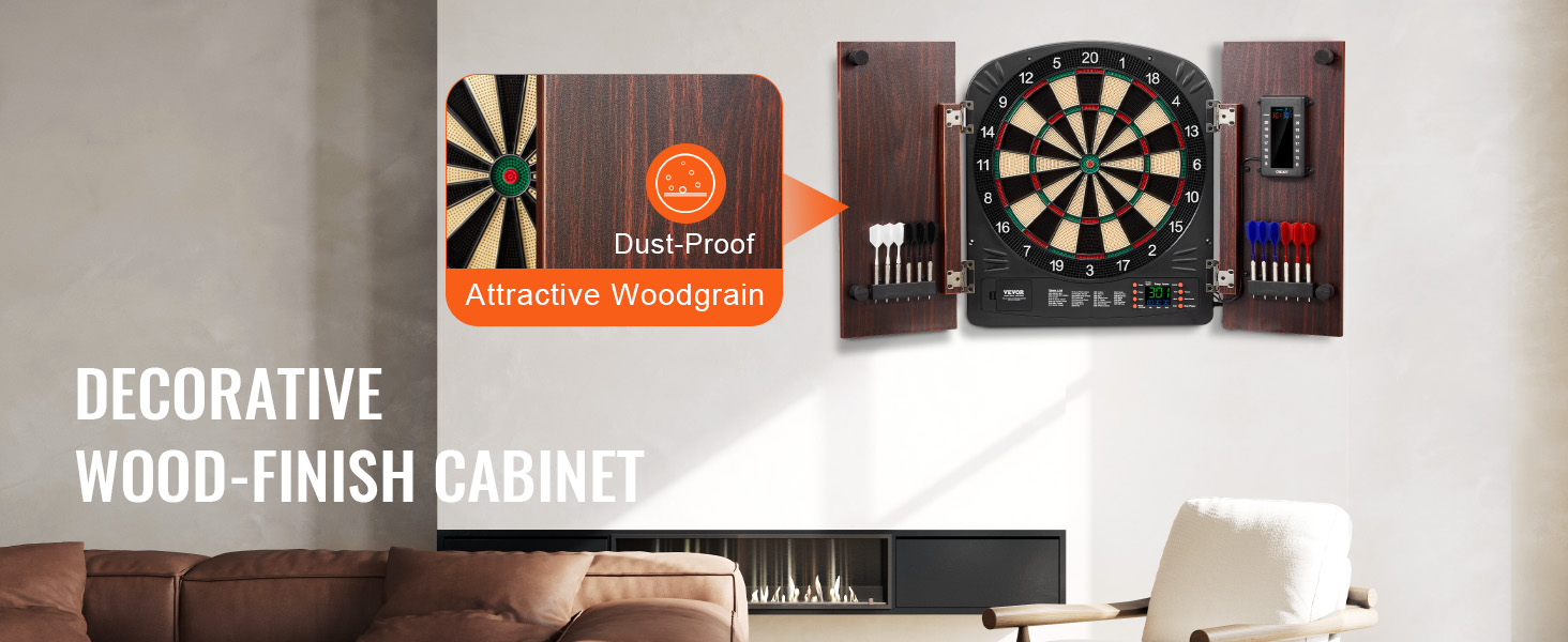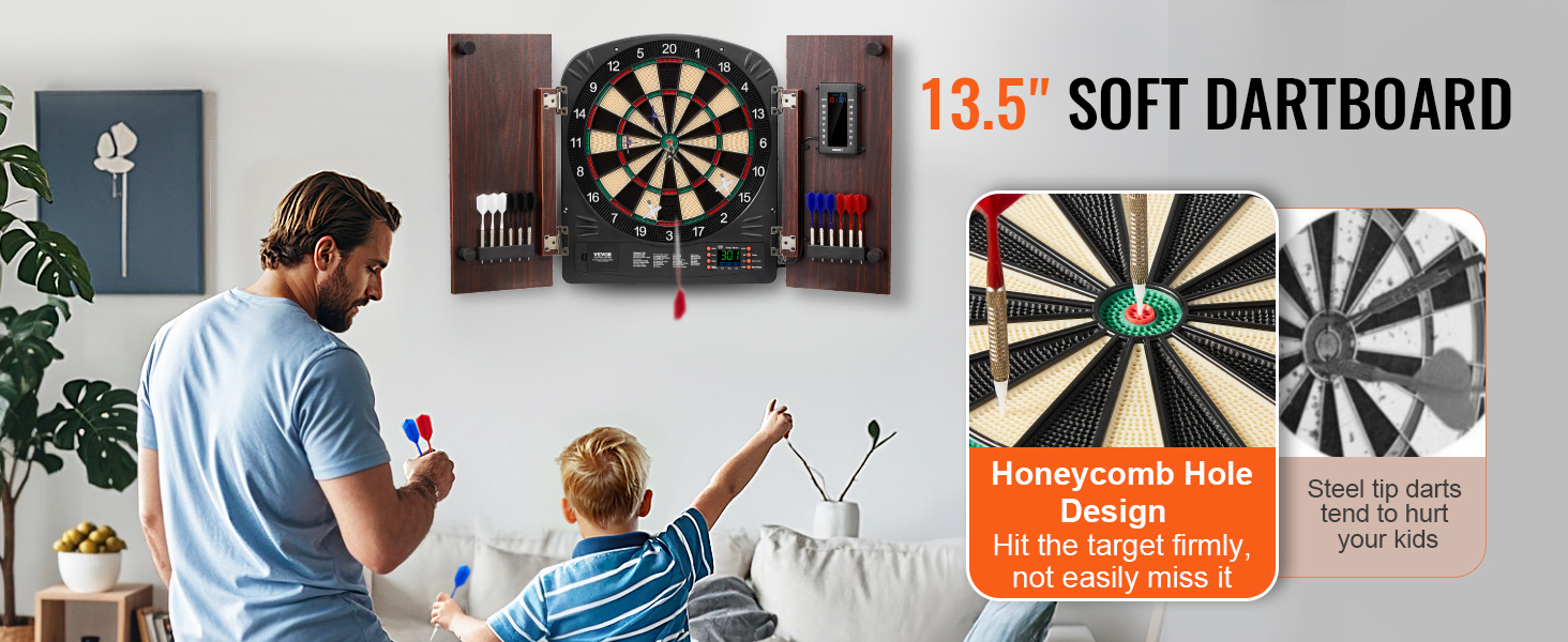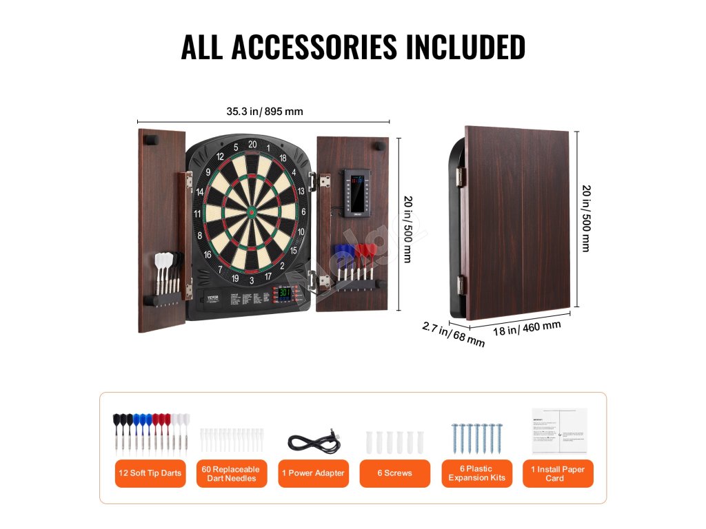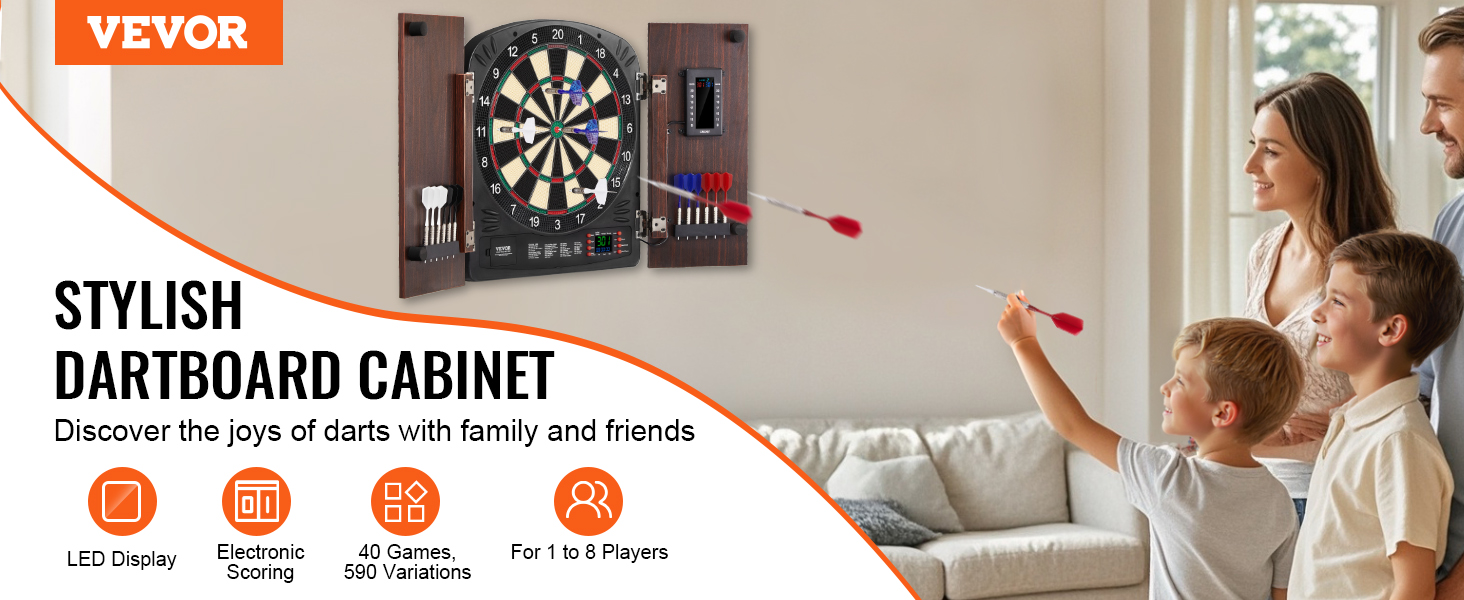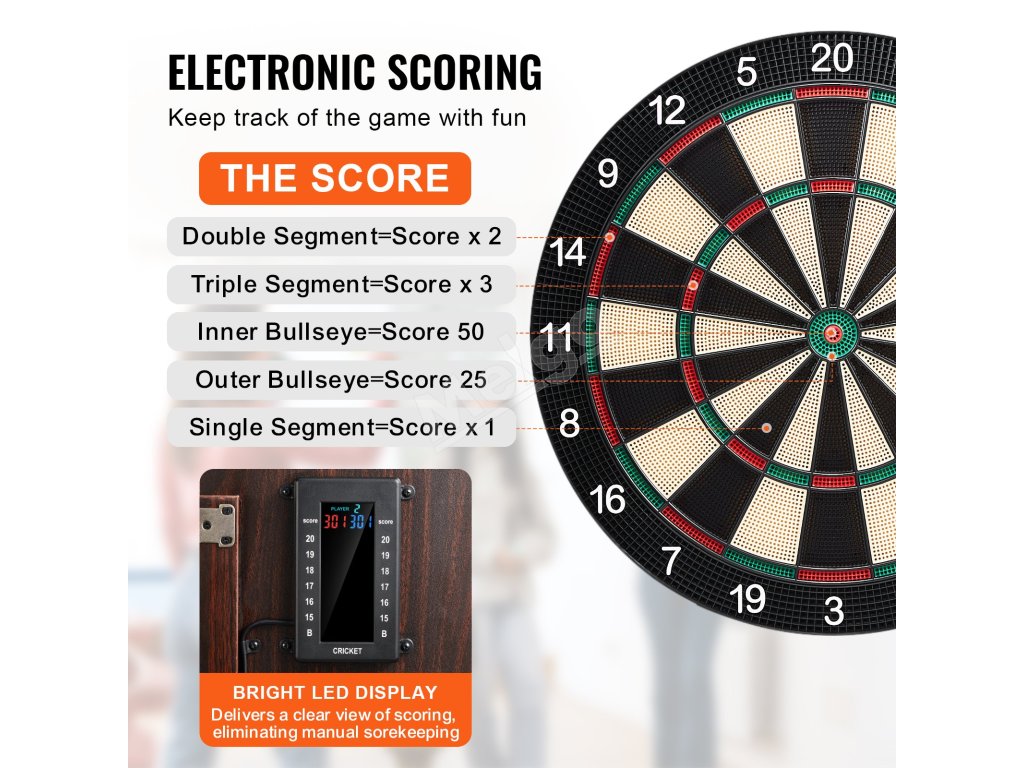Táto súprava šípok a skrinky obsahuje 40 rôznych hier s 590 variantmi, ktoré sú vhodné pre 1 až 8 hráčov. Displej LED a nastaviteľné nastavenia zvuku zlepšujú hranie.