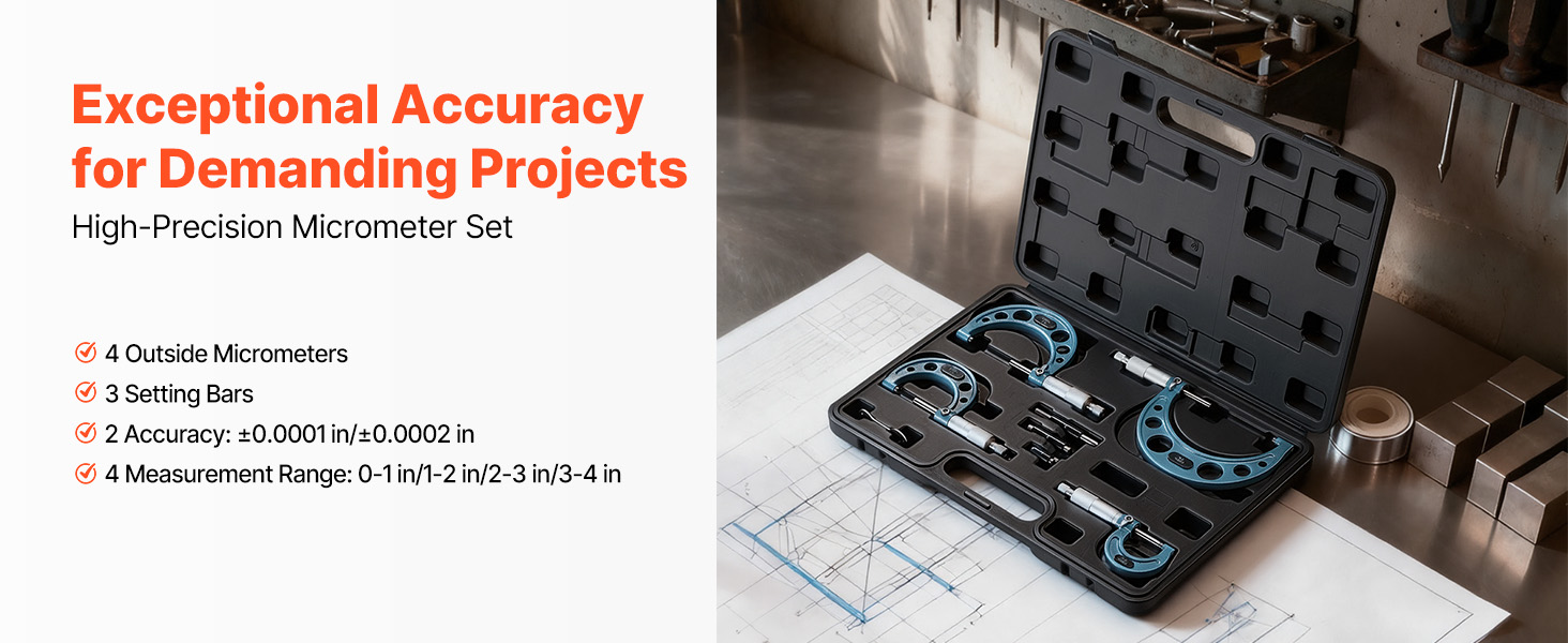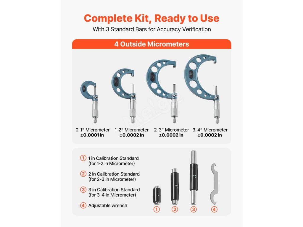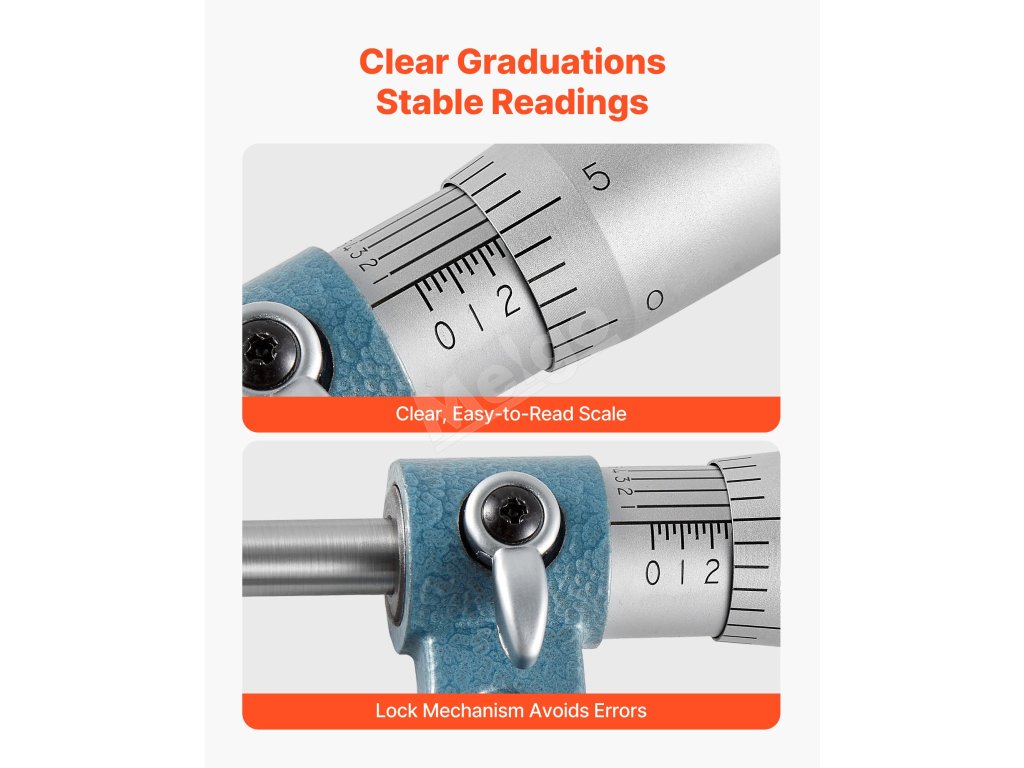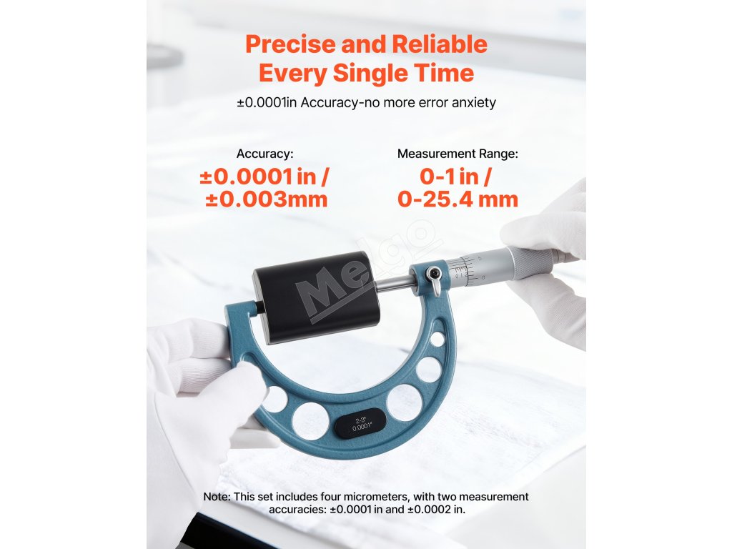 Táto sada mikrometrov je vyrobená z tvrdeného kovu pre dlhodobé používanie. Jeho vreteno s karbidovým hrotom a uzamykací mechanizmus vyvíjajú rovnomerný tlak, čím zabezpečujú presné merania v priebehu času a robia z neho spoľahlivého spoločníka v dielni.