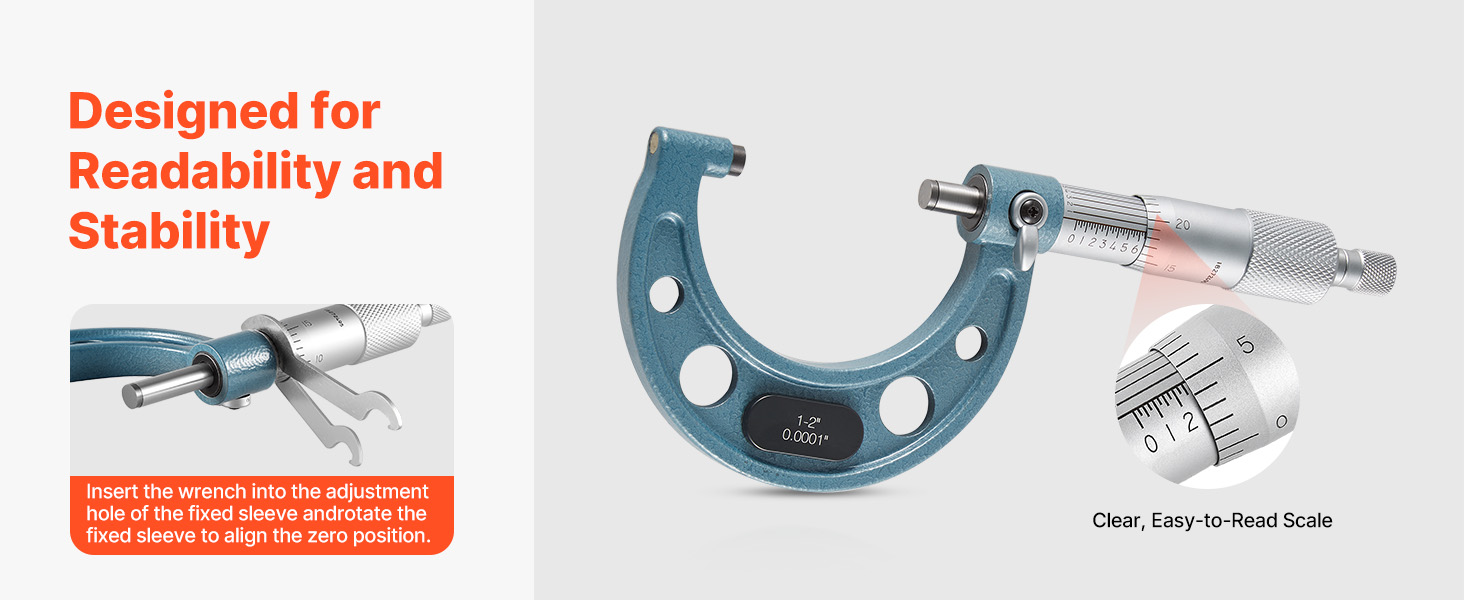 Tento mikrometer má mechanickú konštrukciu, ktorá nevyžaduje batérie, čo umožňuje presné merania za akýchkoľvek podmienok. Prehľadná stupnica je ľahko čitateľná a priložená kalibračná tyč pomáha udržiavať dlhodobú presnosť merania.