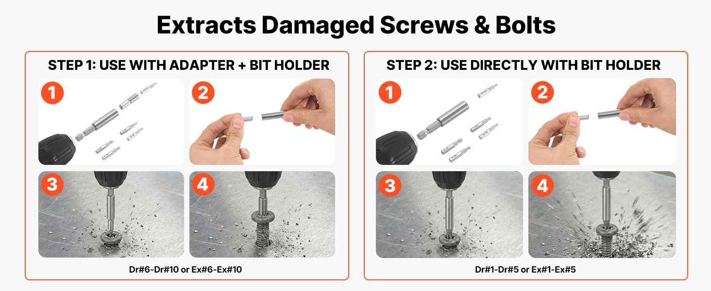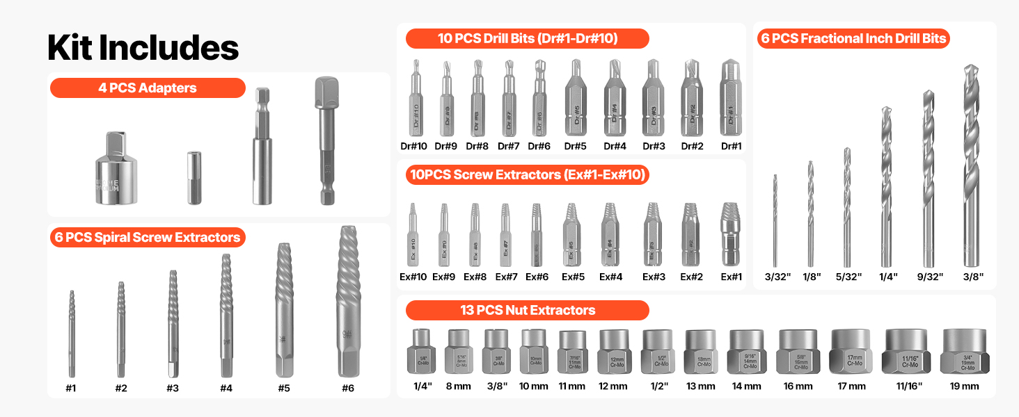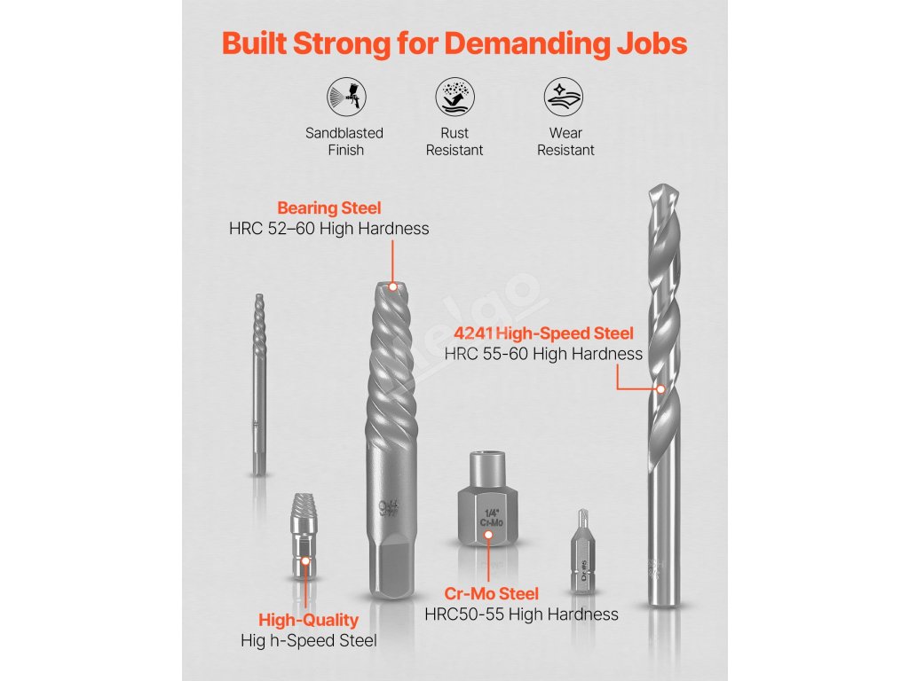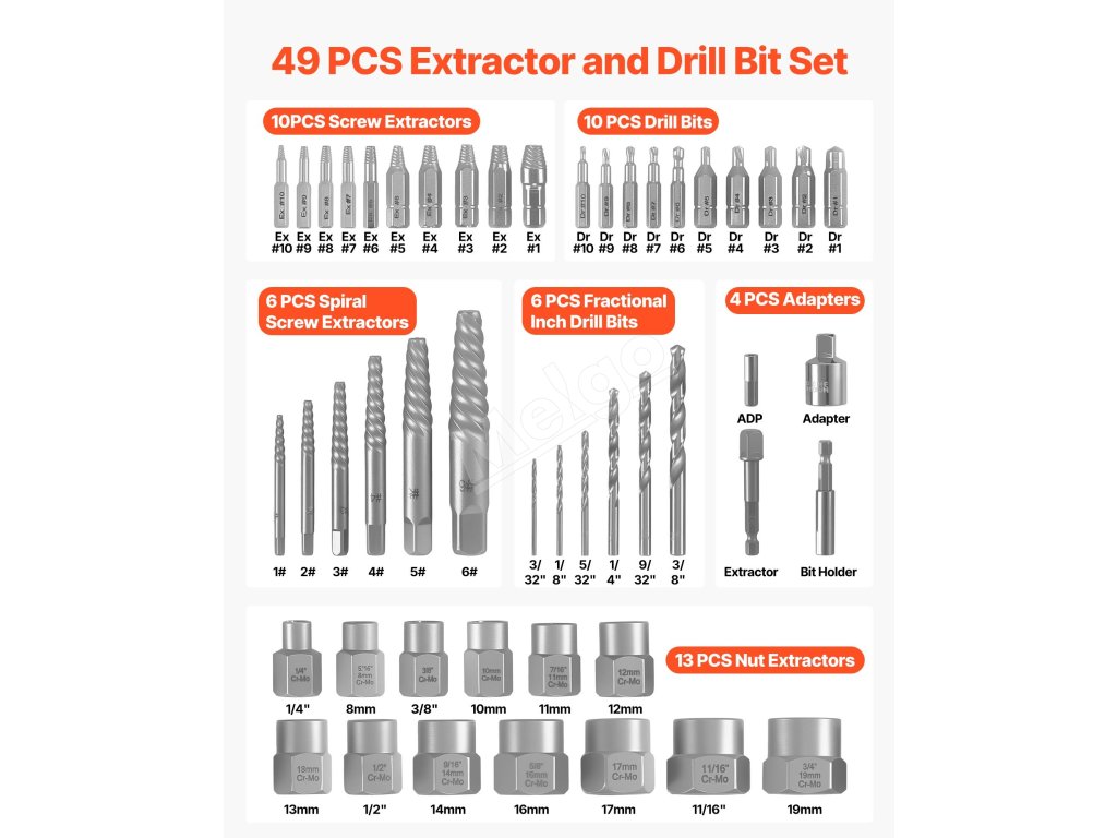 Táto sada na vyťahovanie skrutiek obsahuje viacero typov vyťahovačov a vrtákov rôznych veľkostí, vďaka čomu môžete s istotou pracovať s plytko, hlboko, zlomenými alebo zaseknutými skrutkami.