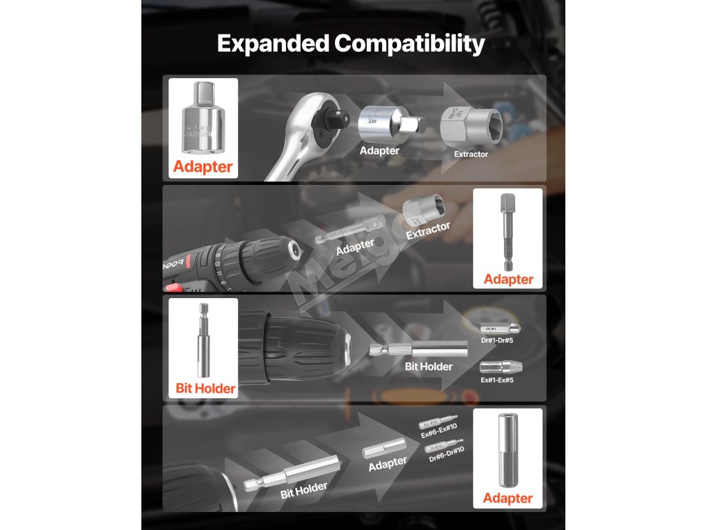 Naša sada na vyťahovanie skrutiek je navrhnutá tak, aby sa dala hladko integrovať s bežným ručným a elektrickým náradím, takže môžete pokračovať v práci s vaším obľúbeným vybavením.