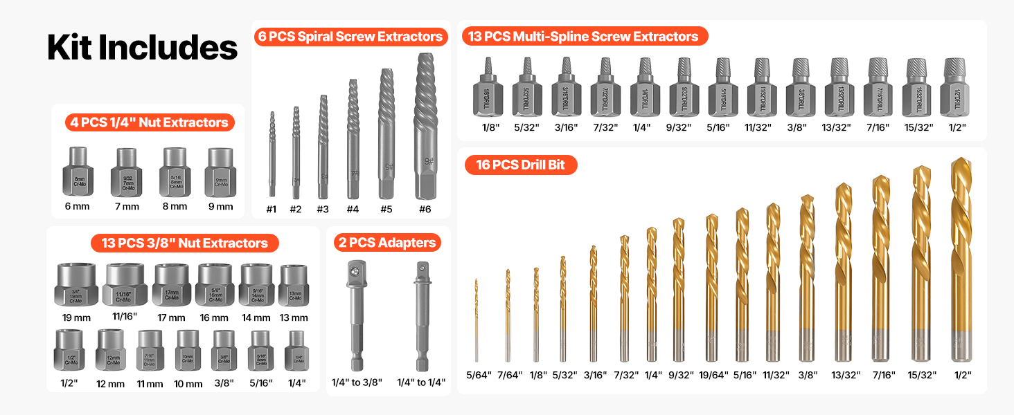 Od poškodených skrutiek po zaseknuté svorníky – táto komplexná sada na vyťahovanie poškodených svorníkov a vŕtačiek vám pomôže rýchlejšie dokončiť prácu.