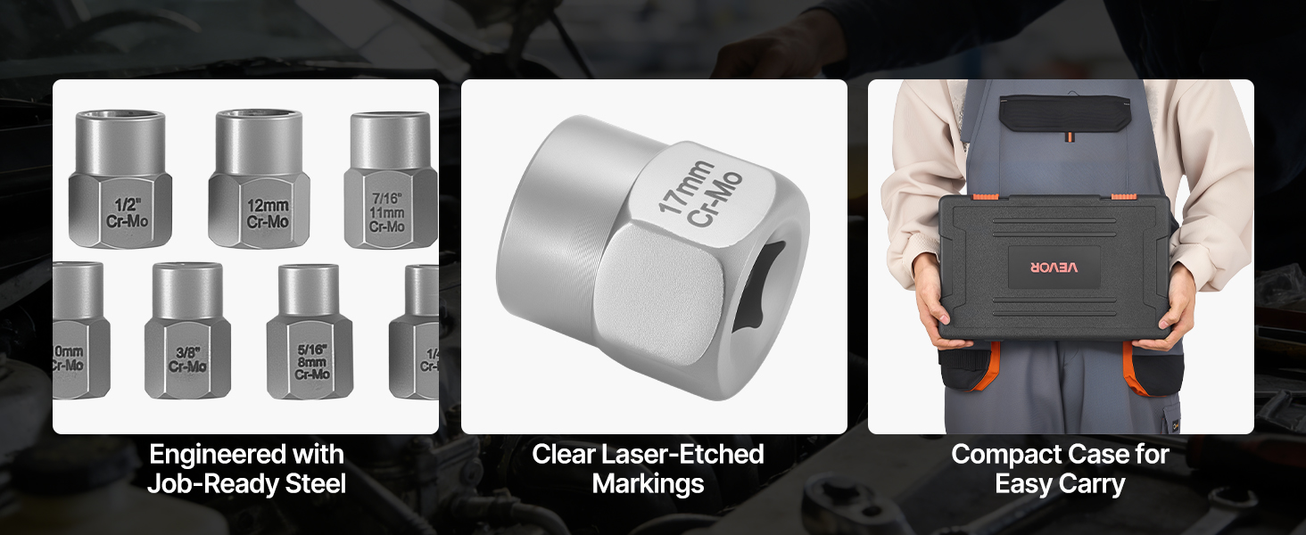 Táto sada na vyťahovanie skrutiek a svorníkov, vyrobená z starostlivo vybraných materiálov a s jasným označením, pomáha zabezpečiť konzistentný výkon pri častých alebo náročných opravách.