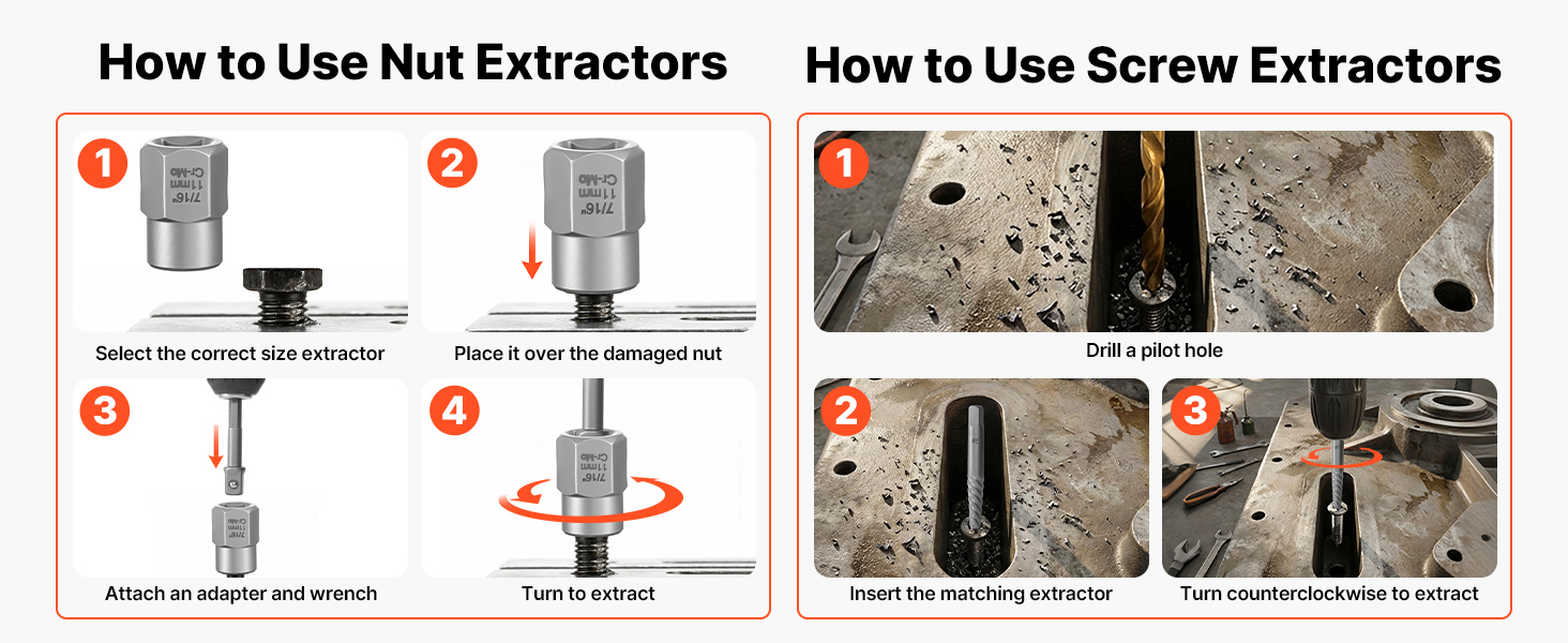 Prehľadný postup extrakcie odstraňovača poškodených skrutiek pomáha znížiť počet chýb a zvýšiť úspešnosť, aj pri práci s veľmi poškodenými spojovacími prvkami.