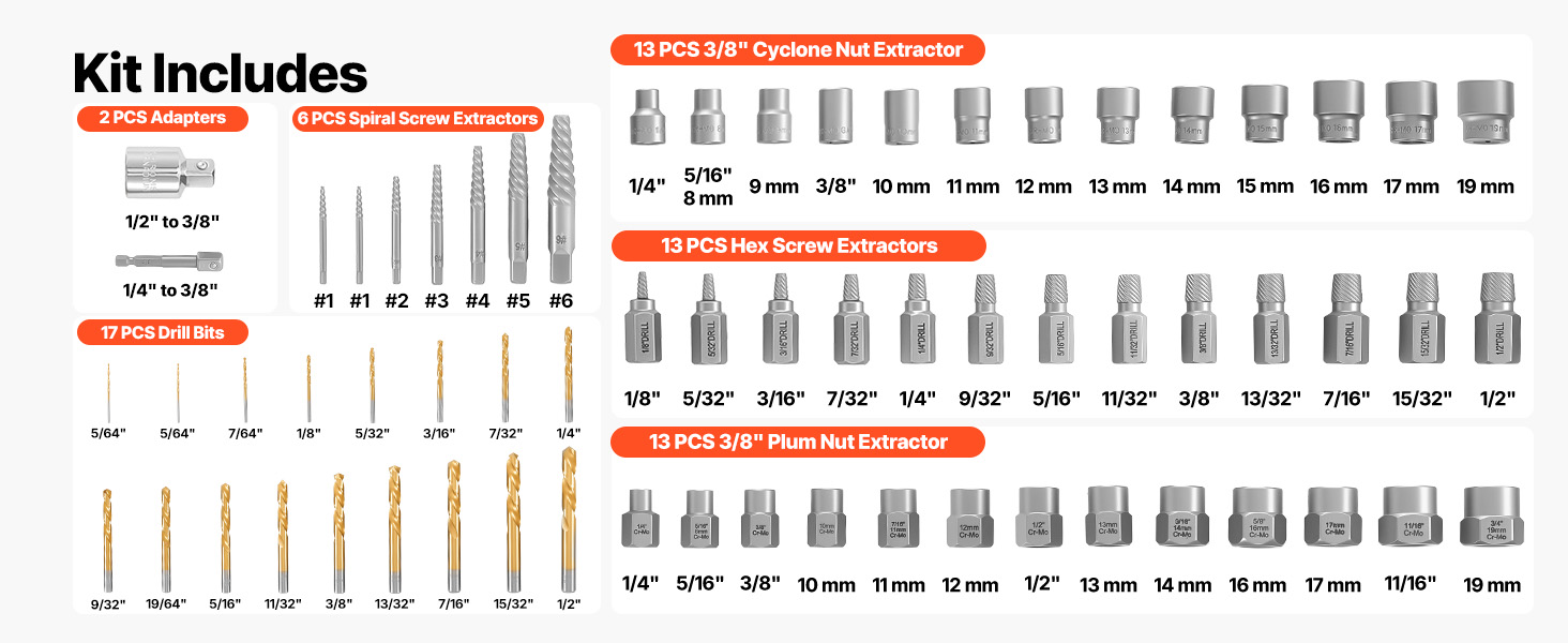 Táto sada na vyťahovanie skrutiek obsahuje viacero typov vyťahovačov a vrtákov rôznych veľkostí, vďaka čomu môžete flexibilne a s istotou pracovať s plytko, hlboko, zlomenými alebo zaseknutými skrutkami.