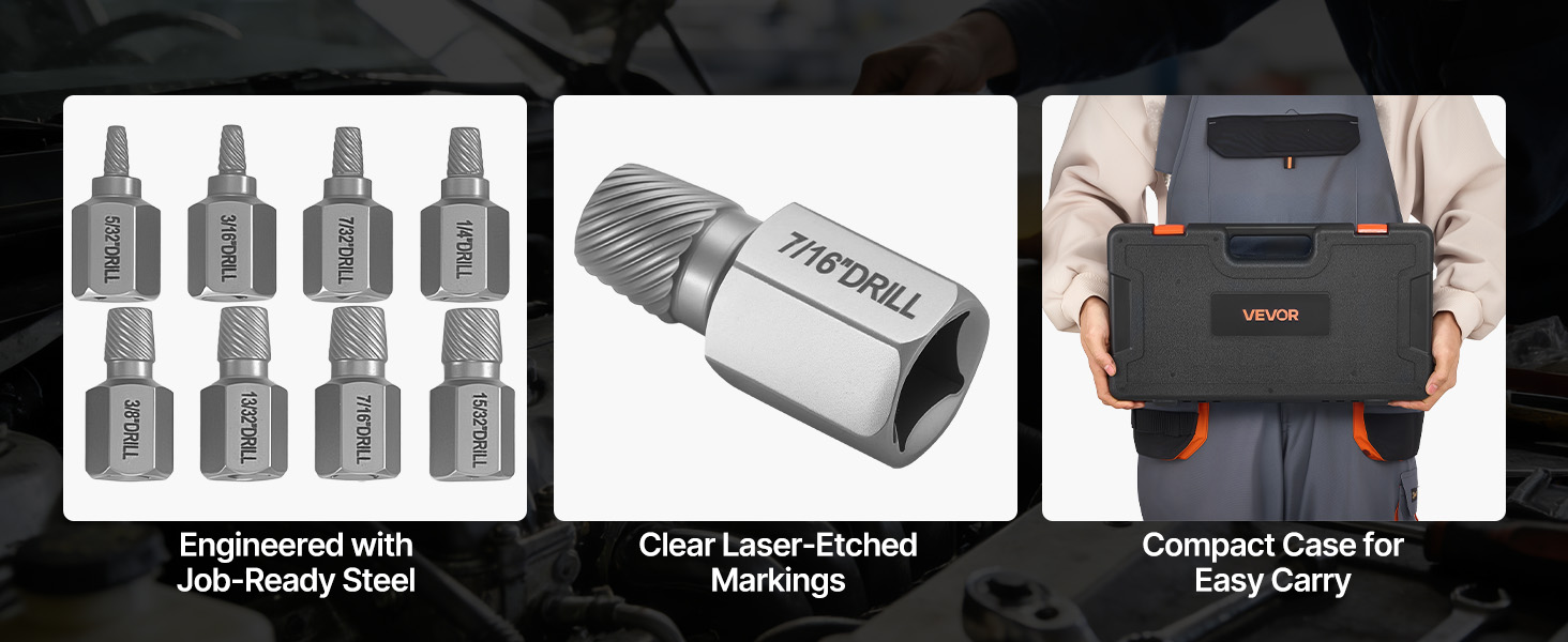 Táto sada na vyťahovanie skrutiek a svorníkov, vyrobená z starostlivo vybraných materiálov a s jasným označením, pomáha zabezpečiť konzistentný výkon pri častých alebo náročných opravách.