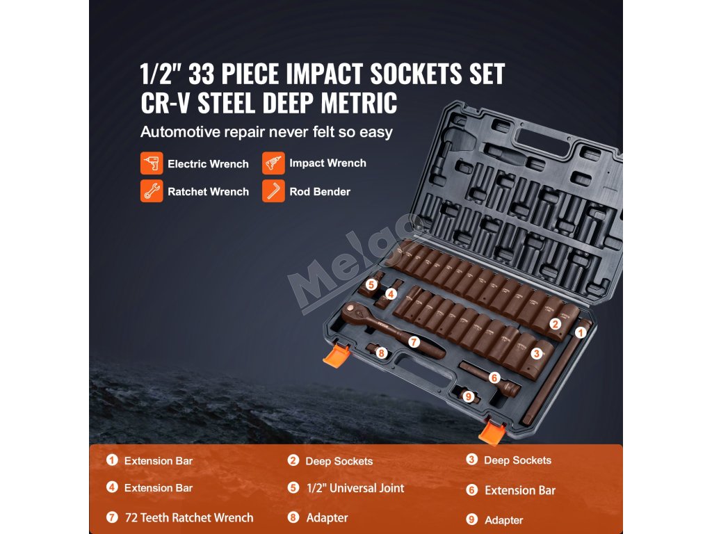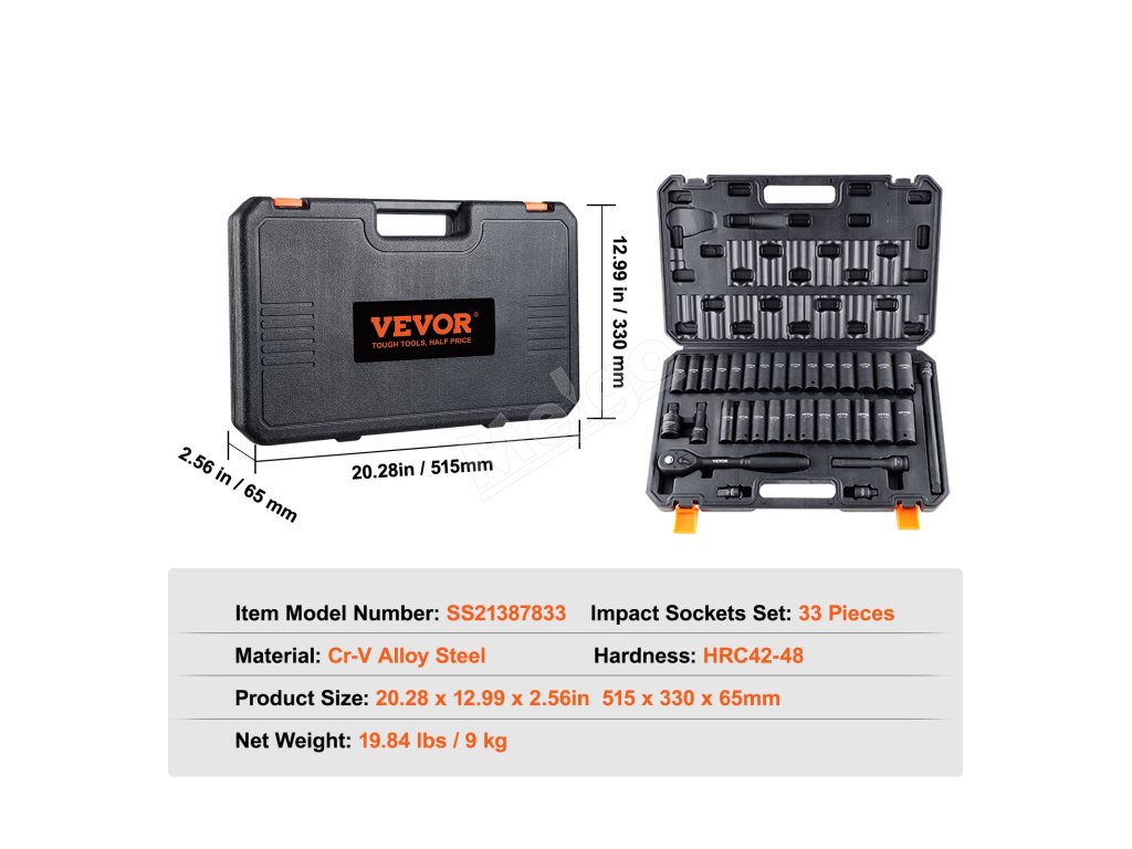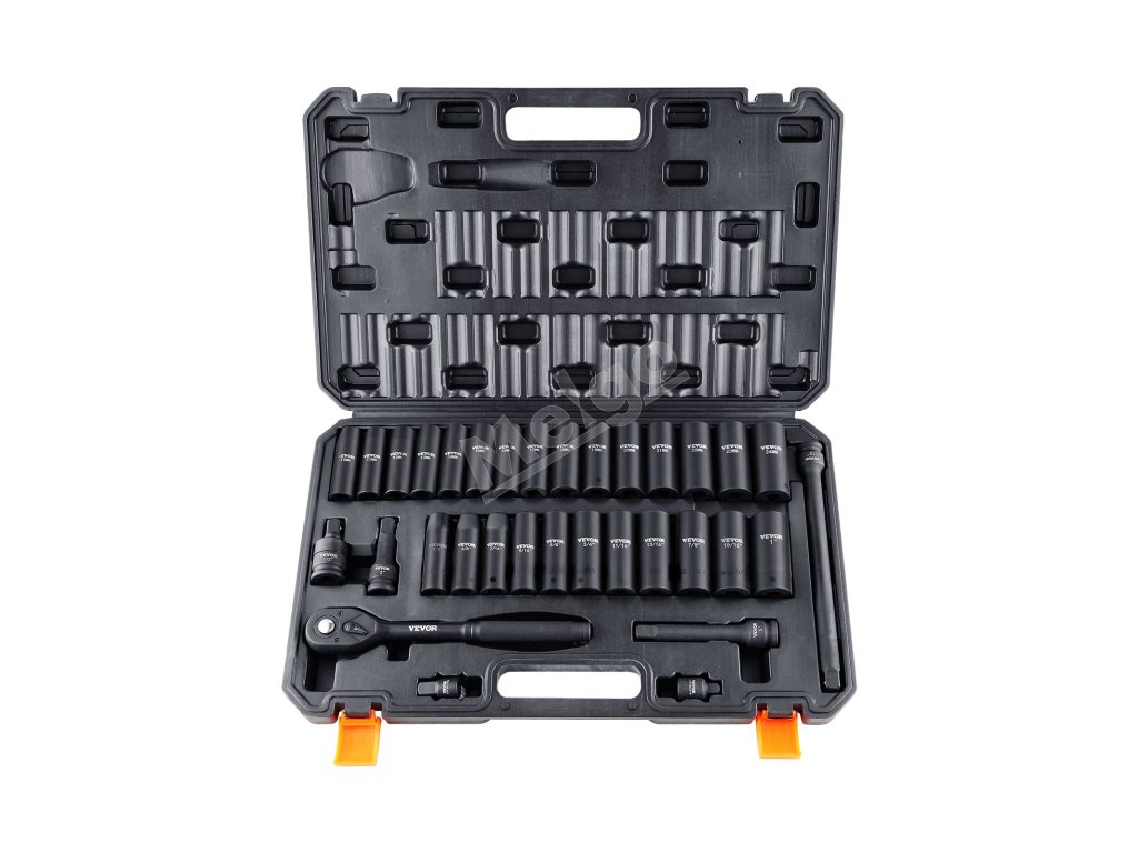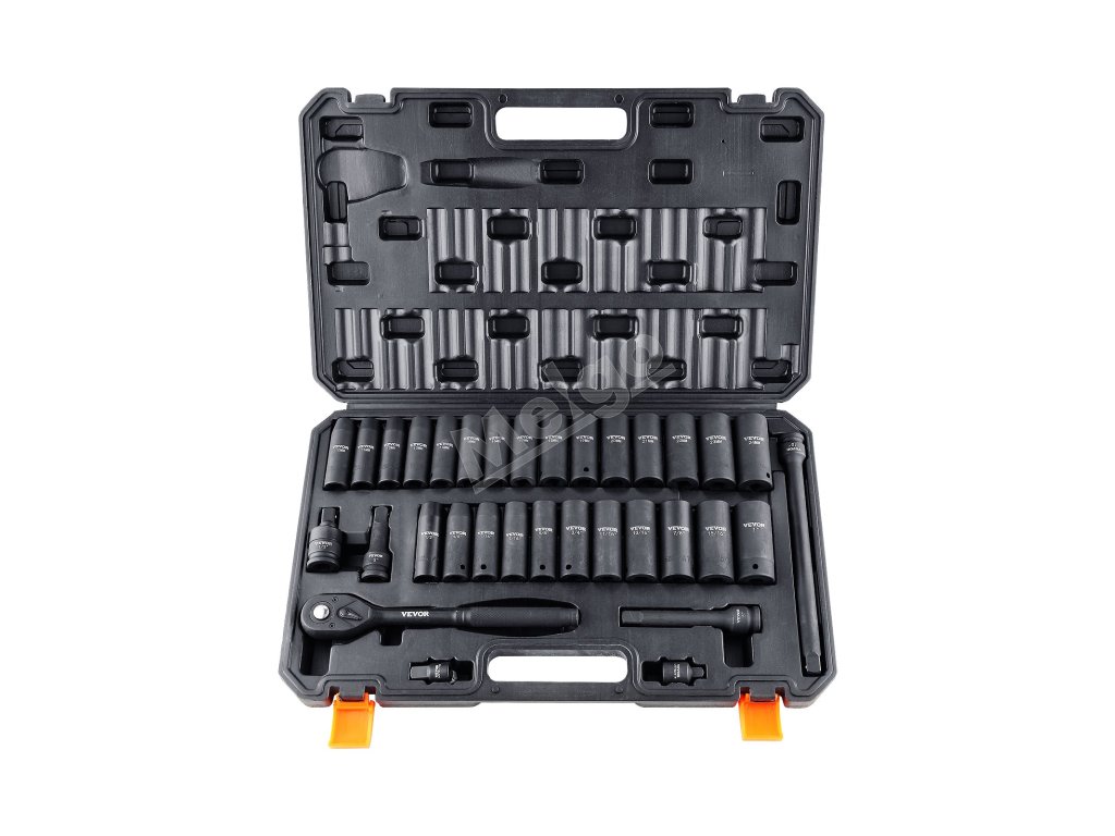 Hľadáte profesionálnu a prenosnú sadu rázových hlavíc? 33-dielna sada rázových nástrčiek VEVOR ponúka kompletný sortiment náradia, ktorý je vhodný najmä na opravy automobilov rôznych značiek.