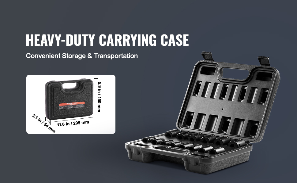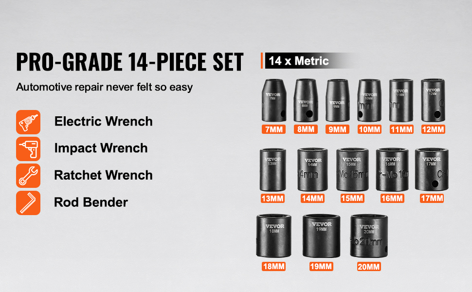 Hľadáte profesionálnu a prenosnú sadu rázových hlavíc? 14-dielna sada rázových nástrčiek VEVOR ponúka kompletný sortiment náradia, ktorý je vhodný najmä na opravy automobilov rôznych značiek.