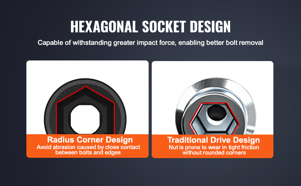 Šesťhranná konštrukcia zásuvky vytvára počas práce medzeru medzi maticou a okrajmi, čím zabraňuje nadmernému treniu a opotrebovaniu. Vydrží väčšiu nárazovú silu a účinne odstraňuje skrutky.