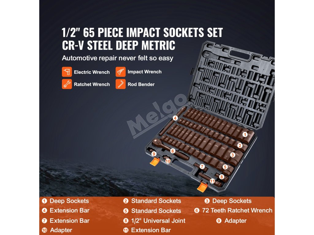 Hľadáte profesionálnu a prenosnú sadu rázových hlavíc? 65-dielna sada rázových nástrčiek VEVOR ponúka kompletný sortiment náradia, ktorý je vhodný najmä na opravy automobilov rôznych značiek.