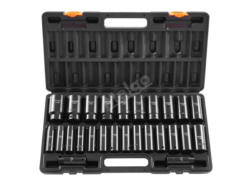 Táto sada hlbokých rázových nástrčiek s 1/2'' pohonom šetrí námahu a obsahuje 26 rázových nástrčiek: 10 mm, 11 mm, 12 mm, 13 mm, 14 mm, 15 mm, 16 mm, 17 mm, 18 mm, 19 mm, 20 mm, 21 mm, 22 mm, 23 mm, 24 mm, 25 mm, 26 mm, 27 mm, 28 mm, 29 mm, 30 mm, 32 mm, 33 mm, 34 mm, 35 mm, 36 mm.