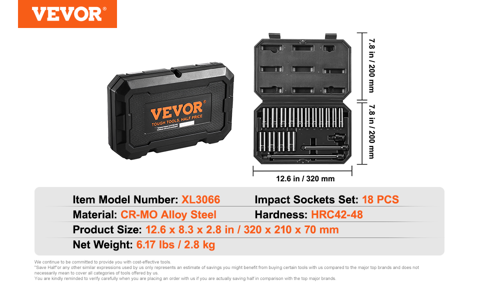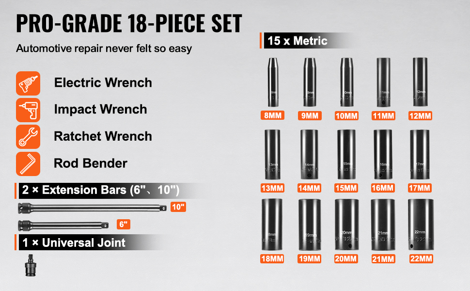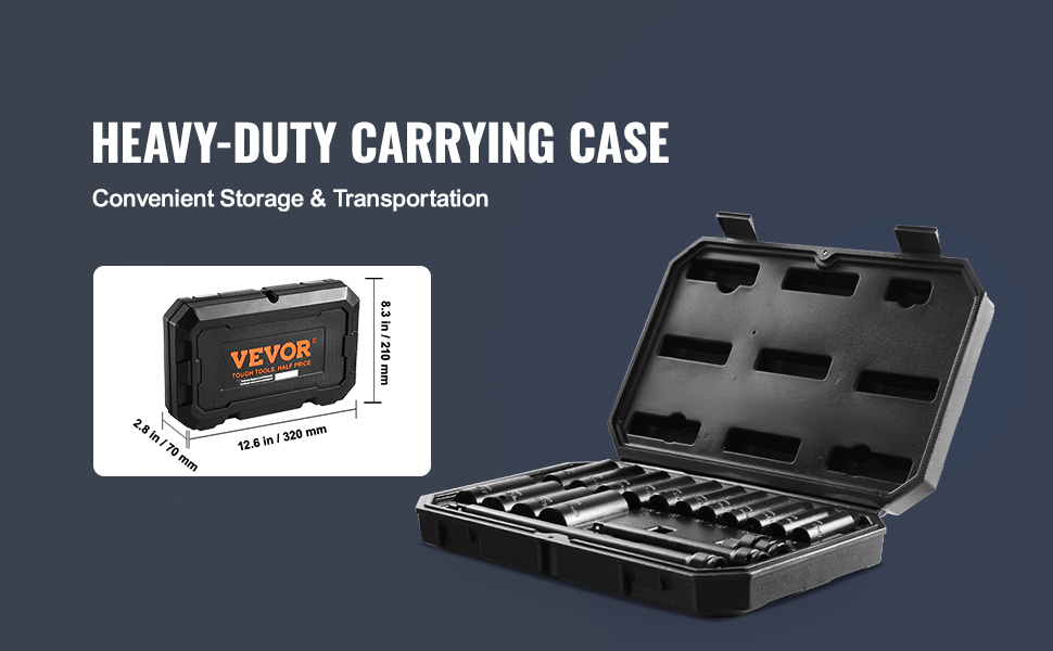 Hľadáte profesionálnu a prenosnú sadu rázových hlavíc? VEVOR 18-dielna sada rázových nástrčiek ponúka kompletný sortiment náradia, ktorý je vhodný najmä na opravy automobilov rôznych značiek.