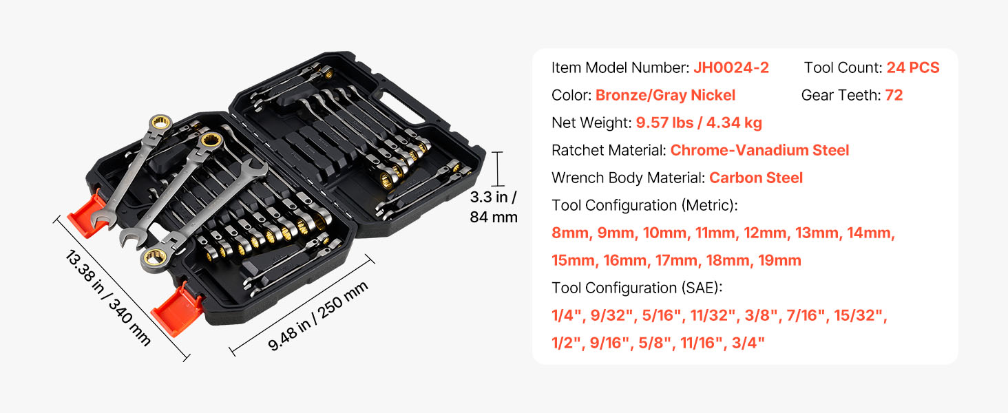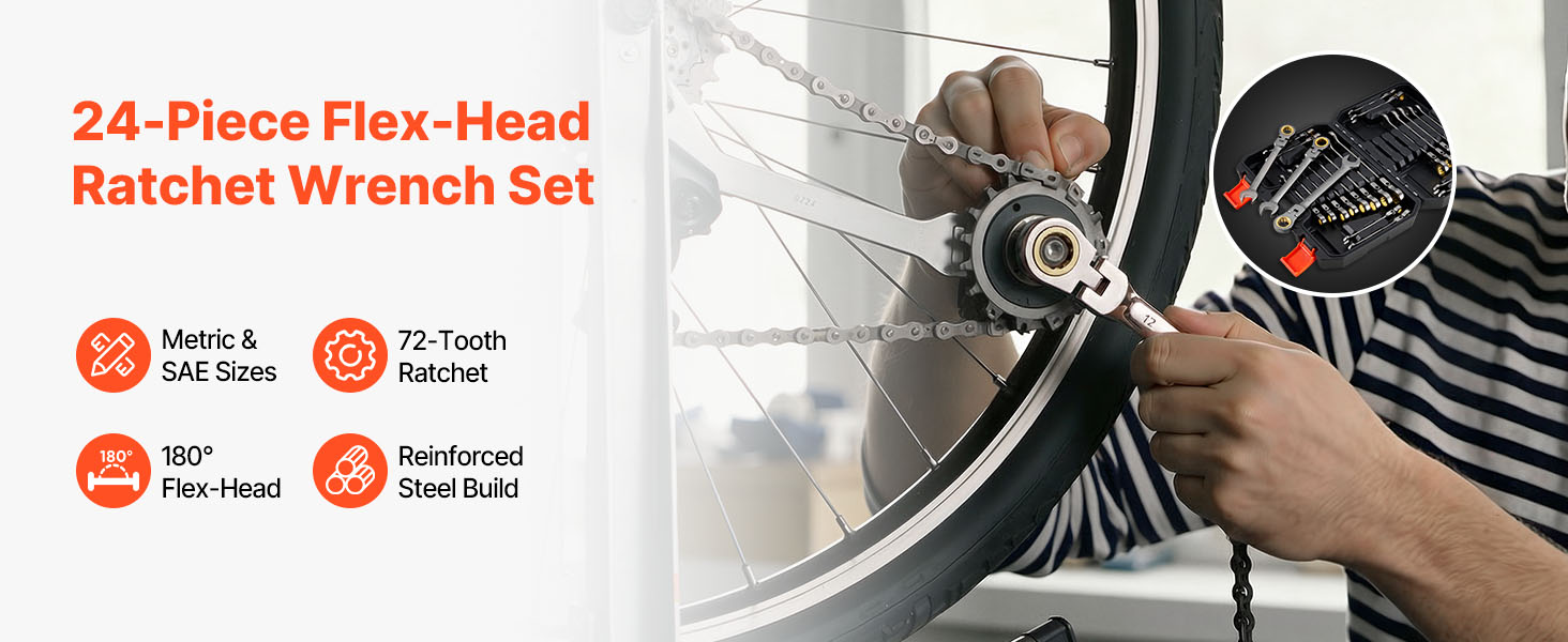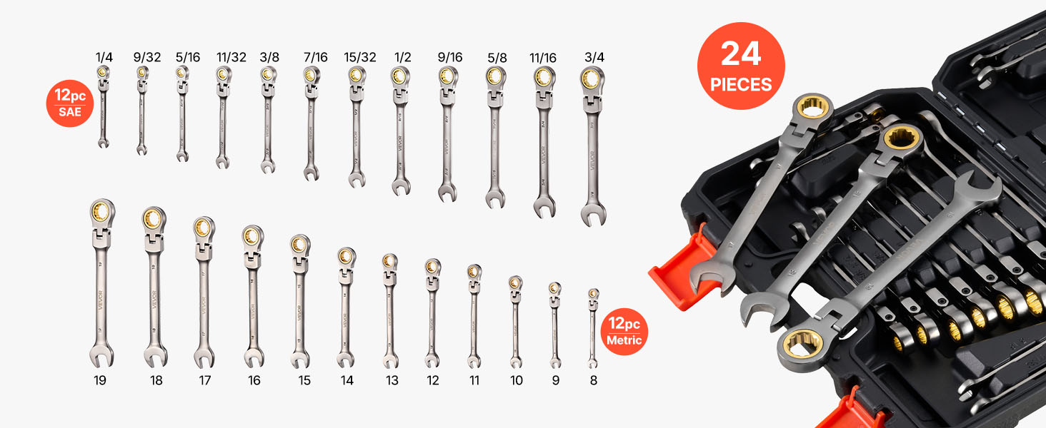 Sada račňových kľúčov s ohybnou hlavou, 24 dielov, 72 zubov, cr-v