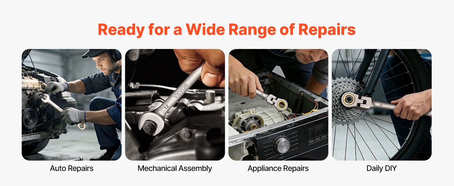 Či už ide o údržbu vozidiel, opravy domácich spotrebičov alebo každodenné projekty DIY, sada kľúčov s račňou sa ľahko prispôsobí rôznym úlohám, čo z nej robí spoľahlivého partnera pre bežné opravy.
