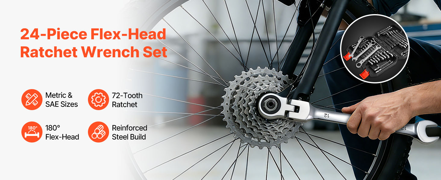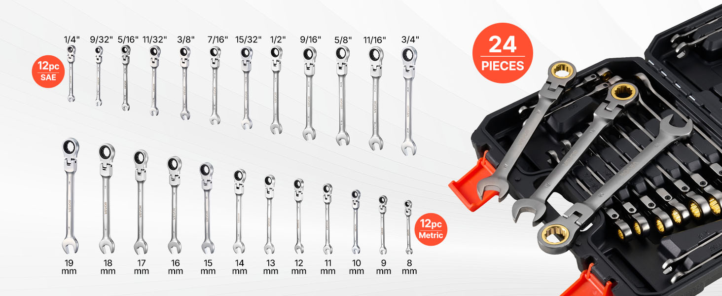 Sada ráčnových očkoplochých kľúčov 24 diel, sae/metrické, 72 zubov