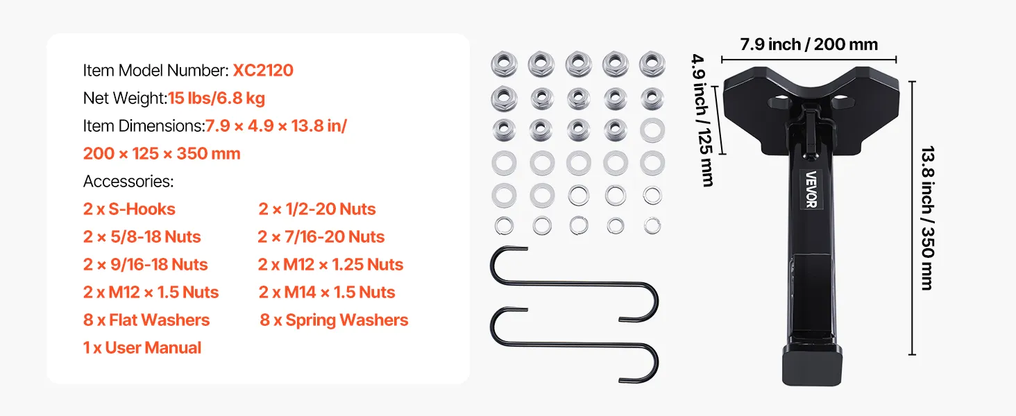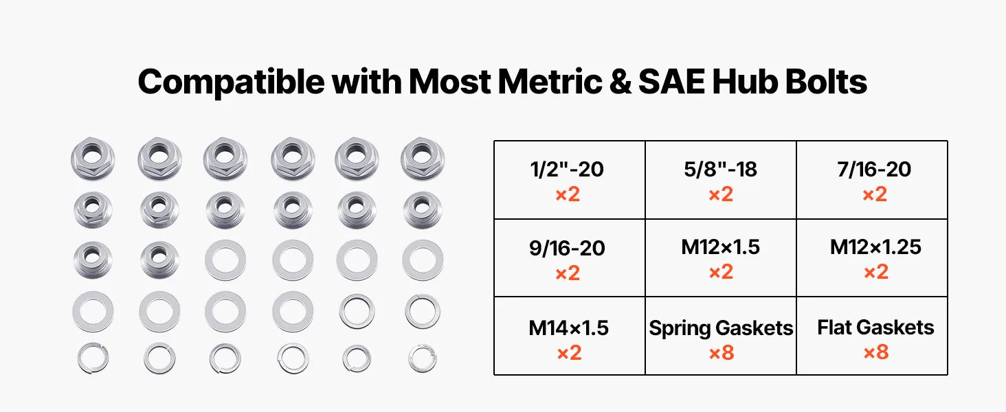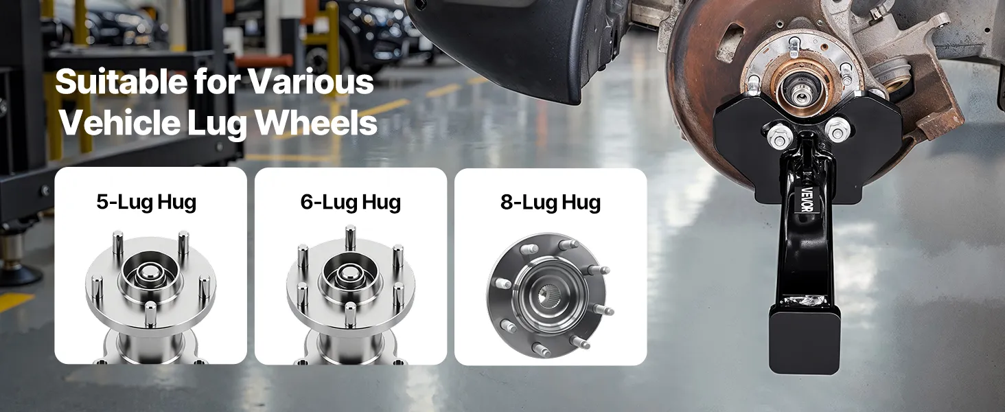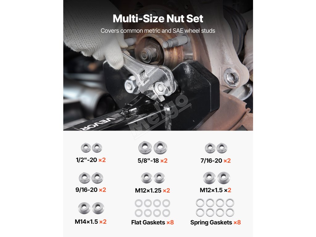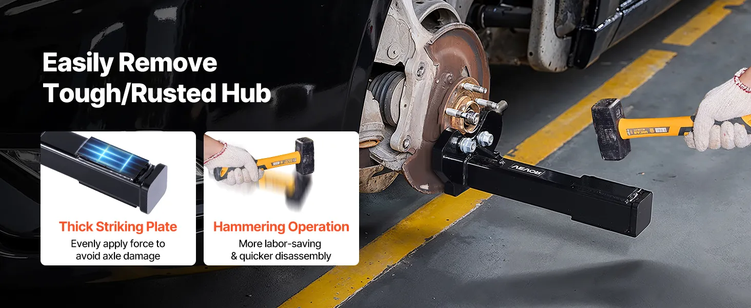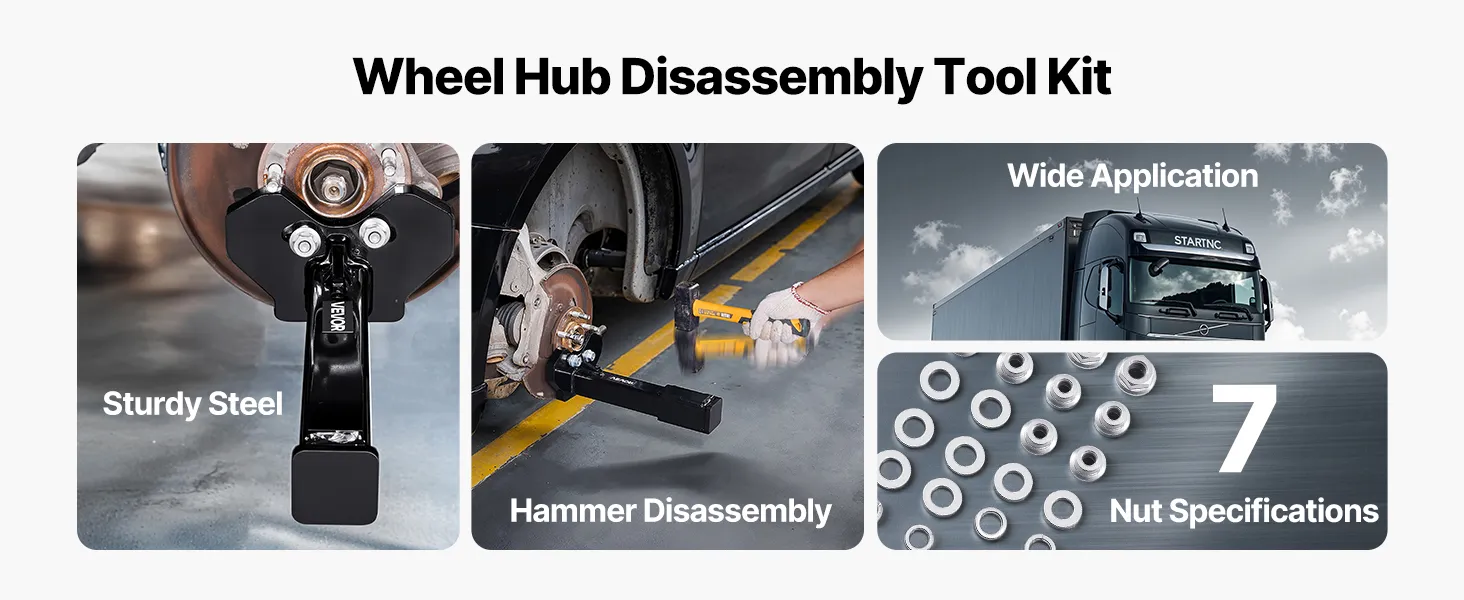 Nástroj na demontáž nábojov kolies je určený pre 5, 6 a 8-lúčové náboje, kompatibilný s osobnými, SUV a nákladnými vozidlami. Podporuje rôzne veľkosti skrutiek vrátane bežných špecifikácií, ako sú 1/2-20 a 5/8-18, čím zabezpečuje širokú použiteľnosť. Vďaka zosilnenej úderovej doske a odolnej oceli je skonštruovaný tak, aby vydržal.