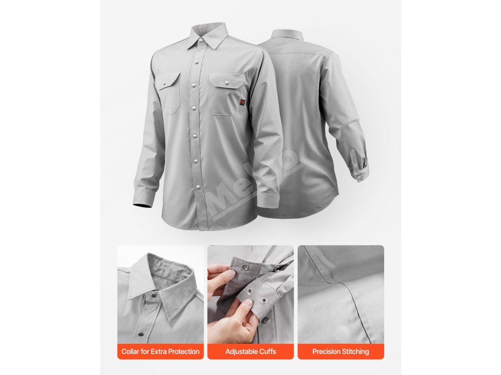 Premyslene navrhnutý golier poskytuje zvýšenú ochranu krku pre väčšiu bezpečnosť. Nastaviteľné manžety ponúkajú lepšie prispôsobenie, čo umožňuje väčšiu flexibilitu počas práce. Vďaka robustným kovovým gombíkom sa zváračská bezpečnostná bunda ľahko oblieka a vyzlieka.